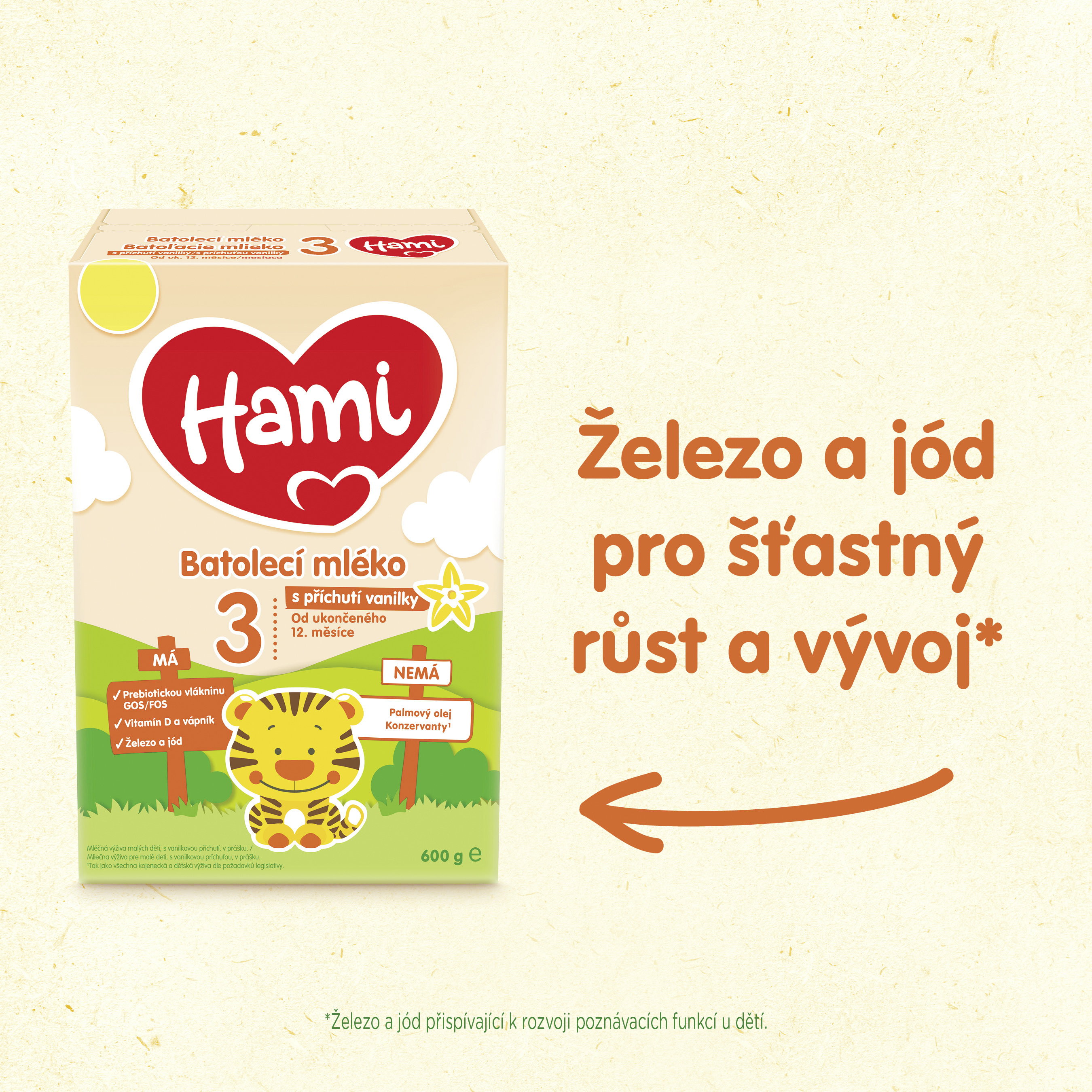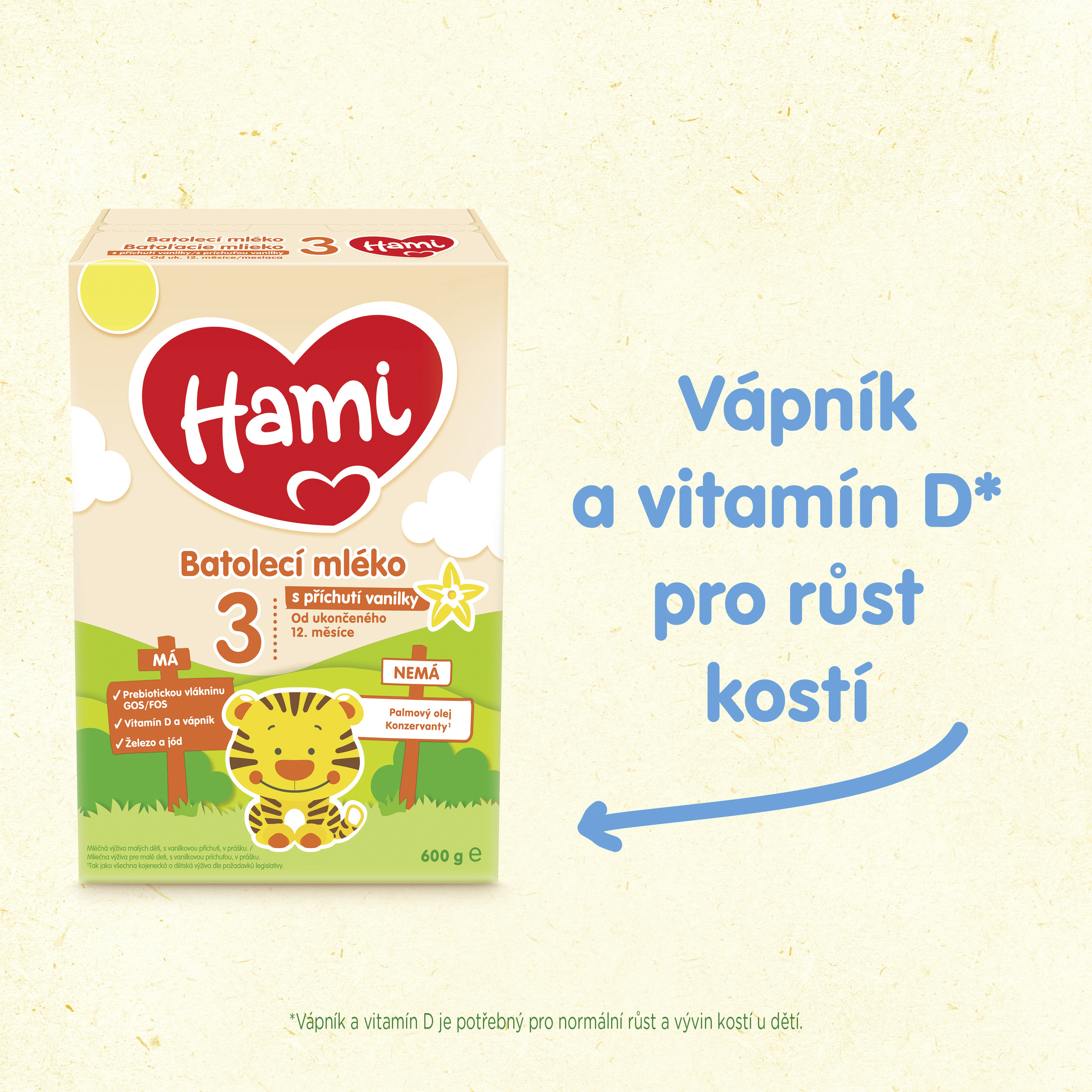 Když z miminka roste malý objevitel, Hami je tu pro vás dál. Batole se rychle rozvíjí – učí se chodit, mluvit a poznávat svět. V tomto období potřebuje výživu, která drží krok s jeho tempem. Hami 3 je batolecí mléko od ukončeného 12. měsíce, které dodává energii, důležité živiny a má chuť, kterou děti dobře přijímají.