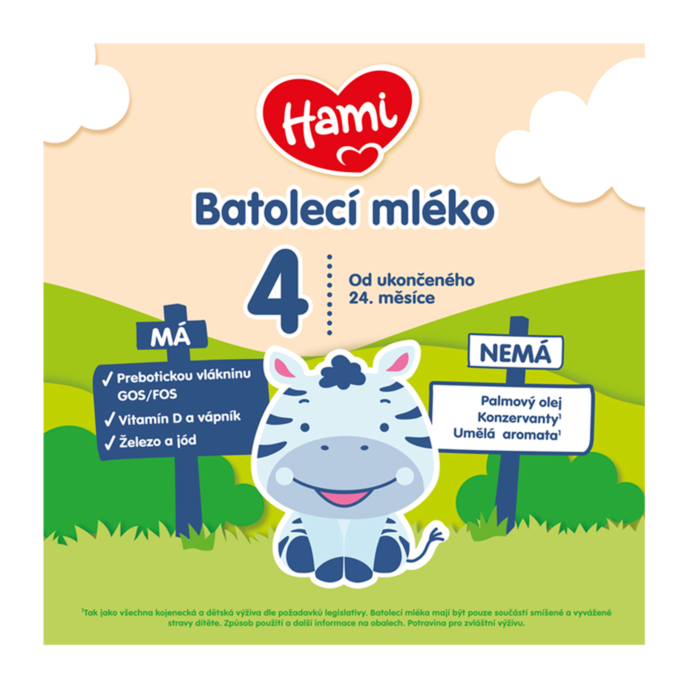Hami 4 je určené pro výživu dětí od 2 let jako součást smíšené a vyvážené stravy dítěte, není náhradou mateřského mléka. Kojení je pro dítě to nejlepší. Vyvarujte se dlouhému kontaktu mléčné výživy se zoubky - zvyšuje riziko výskytu zubního kazu. Pečujte pravidelně o zoubky dítěte, zejména před spaním. Požádejte o radu zubního lékaře. Pro zdraví dítěte je důležité dodržovat návod na přípravu a uvedená doporučení. Hami 4 není určené pro výživu kojenců do 1 roku věku. Podporujeme doporučení WHO - plné kojení v prvních 6 měsících věku a pokračování až do 2 let a dále, spolu se zaváděním bezpečné a vhodné doplňkové stravy.