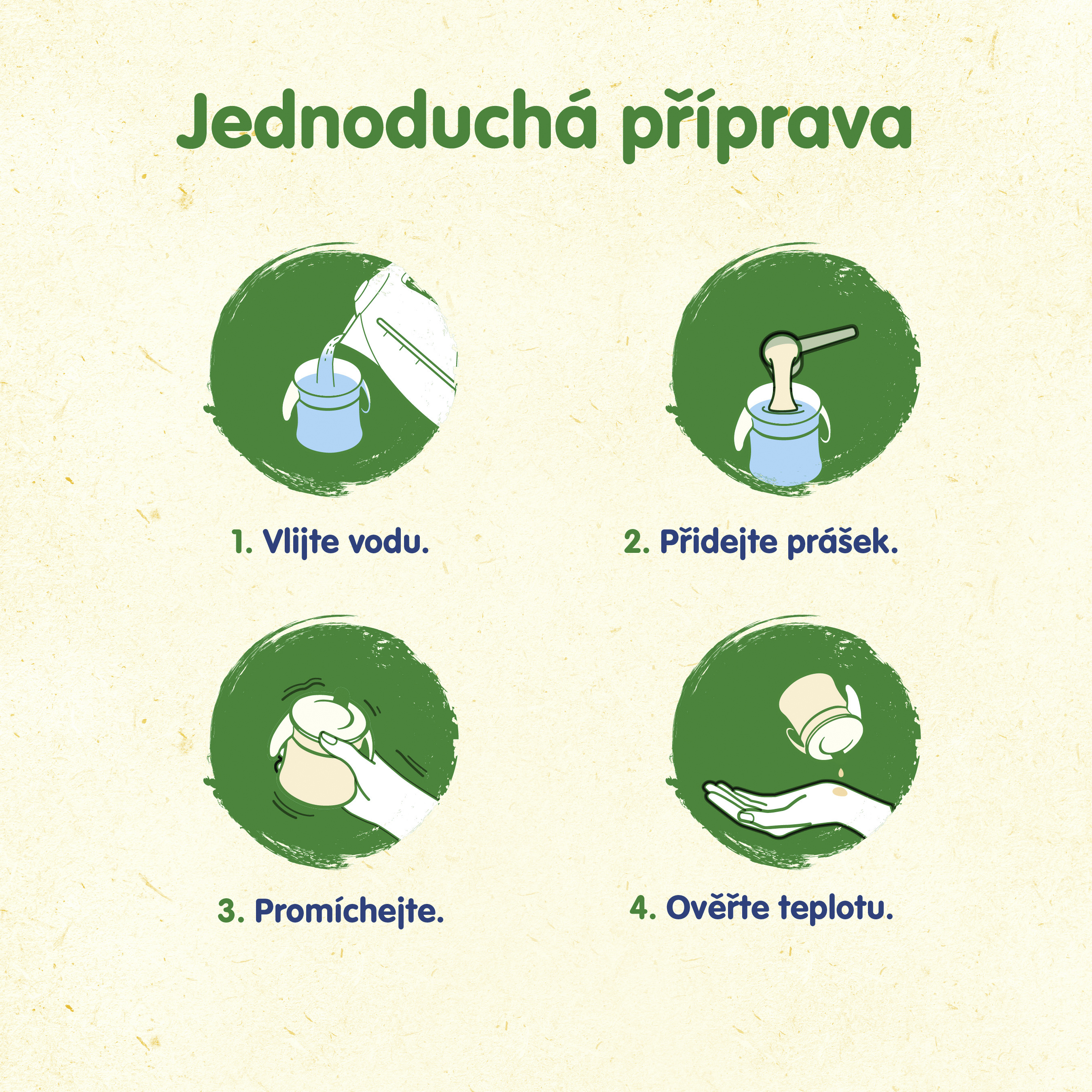 1. Před přípravou si důkladně umyjte ruce. Vysterilizujte všechno používané nádobí a převařte pitnou vodu určenou pro kojence. Nechte jí v konvici vychladnout asi 30 minut na přibližně 40°C. Odpovídající množství převařené vody (viz tabulka) vlijte do vysterilizovaného hrnečku. 2. Do hrnečku s vodou přidejte odpovídající množství prášku (viz tabulka). Na dávkování vždy používejte přiloženou odměrku. Prášek v ní zarovnejte pomocí ploché části nože. 3. Důkladně směs v hrnečku promíchejte. 4. Ověřte teplotu mléčné směsi kápnutím na vnitřní stranu zápěstí a ihned podávejte.