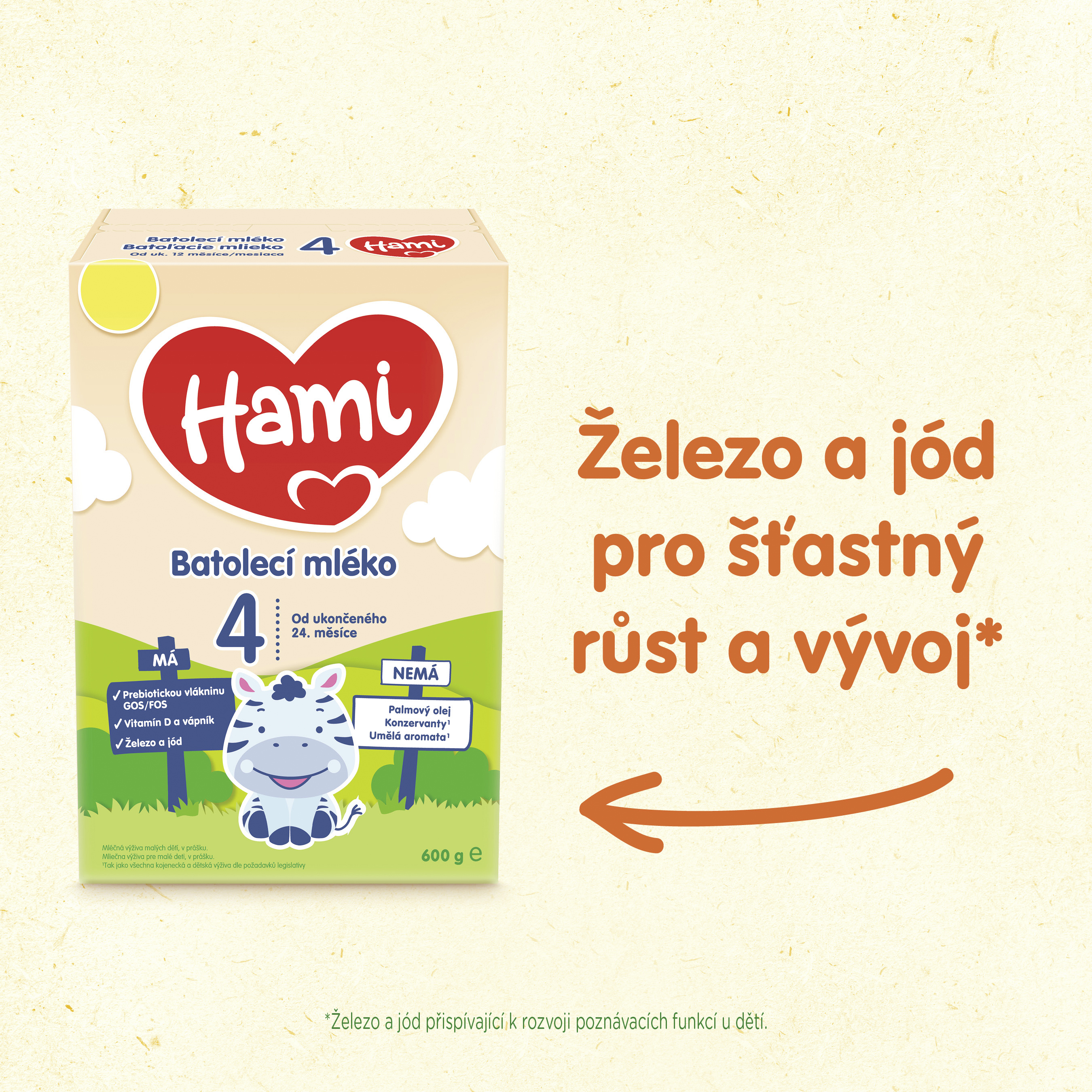 Když z miminka roste malý objevitel - Hami je tu pro vás dál! Batole se rychle rozvíjí a roste a během prvních 3 měsíců Váš malý objevitel už běhá, žvatlá a pořád něco zkoumá? Batole už není miminko - teď víc než kdy jindy potřebuje výživu, která drží krok s jeho tempem. Hami 4 je batolecí mléko od ukončeného 24. měsíce, které pomáhá dodávat optimální energii - bez zbytečností a s chutí, kterou děti milují.