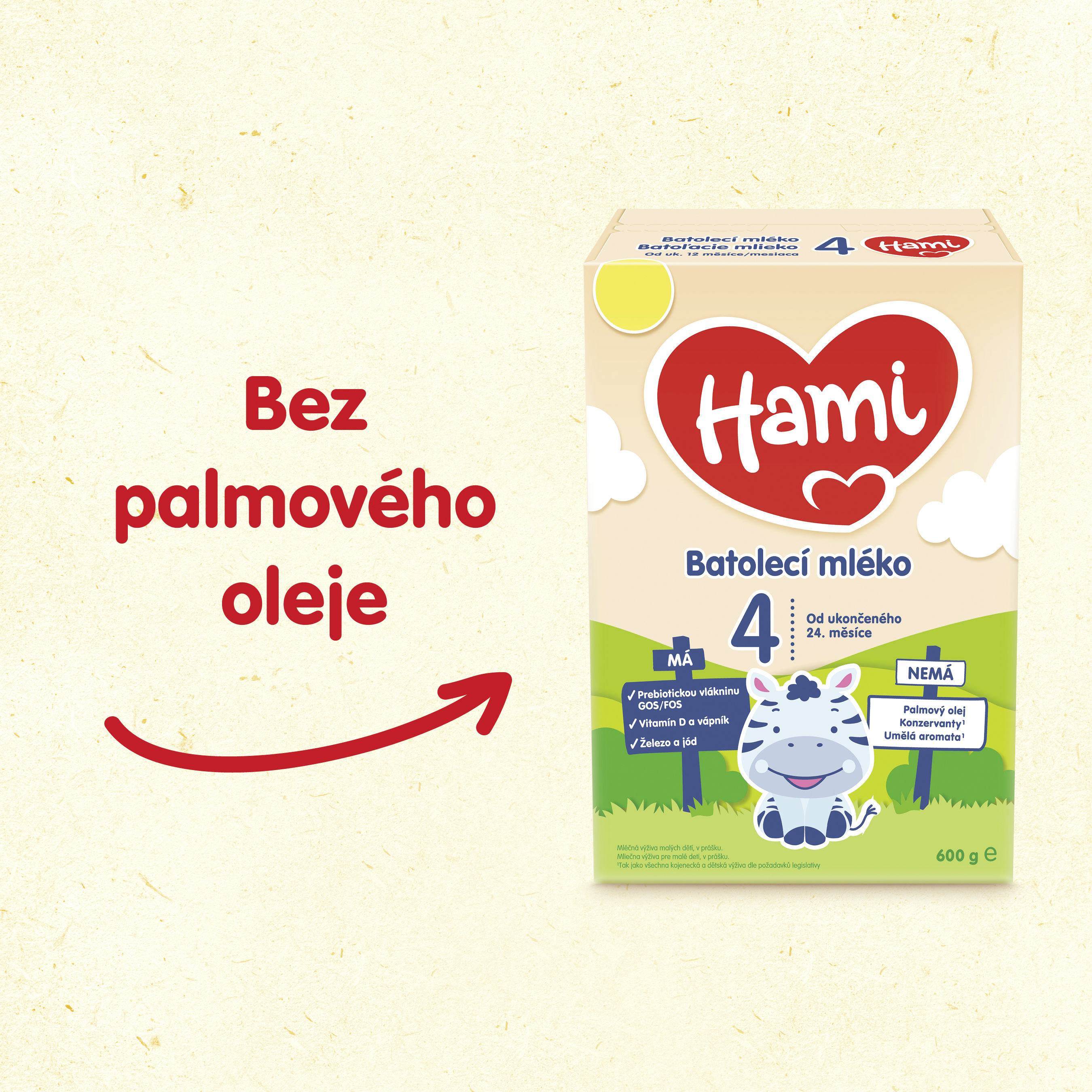 - Palmový olej - všechna pokračovací a batolecí mléka Hami 2-5 jsou bez palmového oleje, což jistě ocení všichni rodiče.