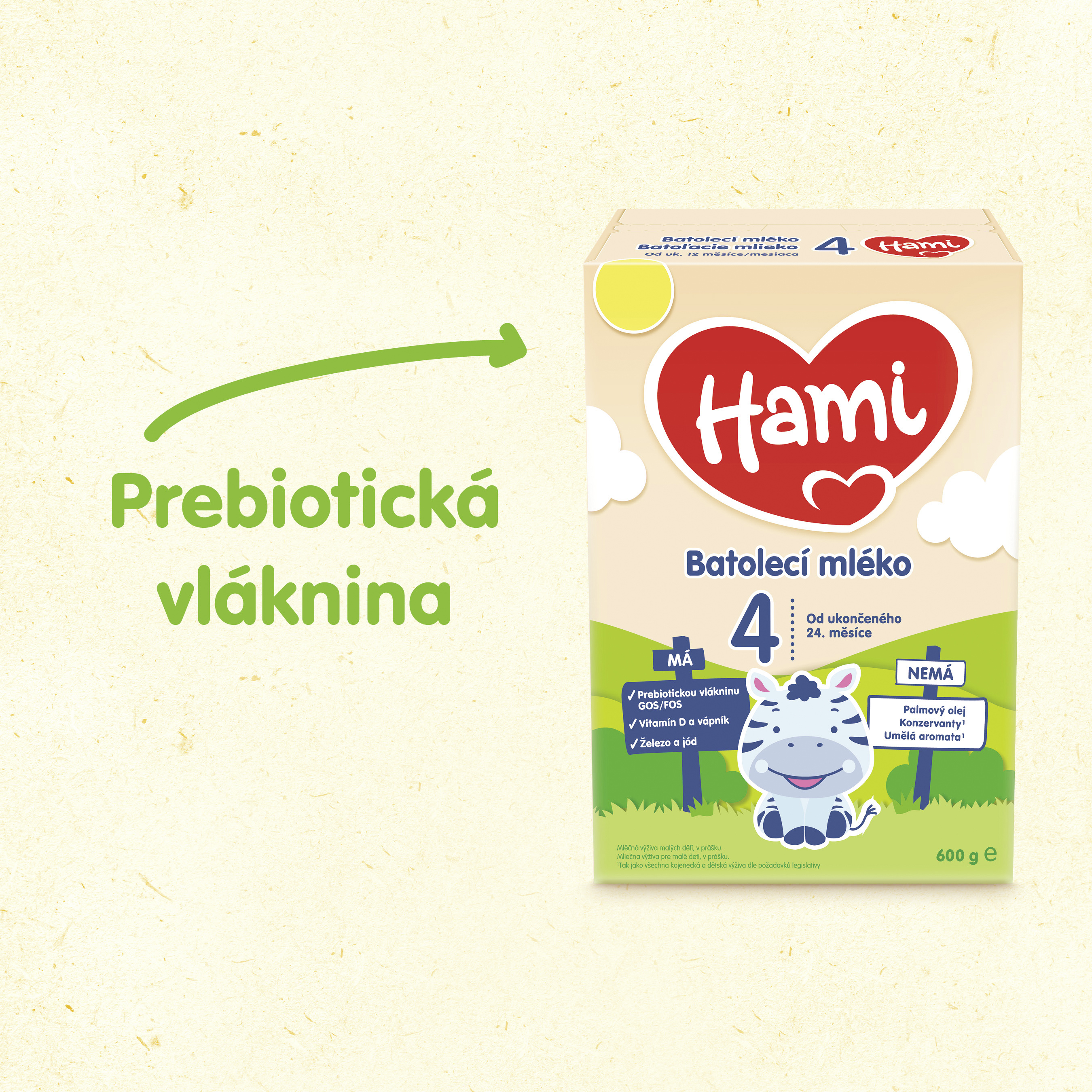 Jedinečné složení OptiNutri s prebiotickou vlákninou (inulín z kořene čekanky) pro klidné bříško - užitečné cukry, které slouží jako potrava pro prospěšné bakterie. Tato vláknina (inulín) se získává z kořene čekanky. Hami 4 je bezpečná a kvalitní volba, která doplní pestrý jídelníček a dodá živiny. Batolecí mléko lépe odpovídá svým složením potřebám malých dětí než jiné mléčné alternativy. Proč je batolecí mléko i nadále důležitou složkou jídelníčku? Mnoho rodičů má za to, že po prvním roce už dítě mléko nepotřebuje, protože jí běžnou stravu. Ve skutečnosti ale batolecí období (od ukončeného 12. do 36. měsíce) představuje velmi náročnou fázi vývoje - tělo i mozek dítěte rostou a rychle se vyvíjí, a právě proto je kvalitní výživa zásadní.