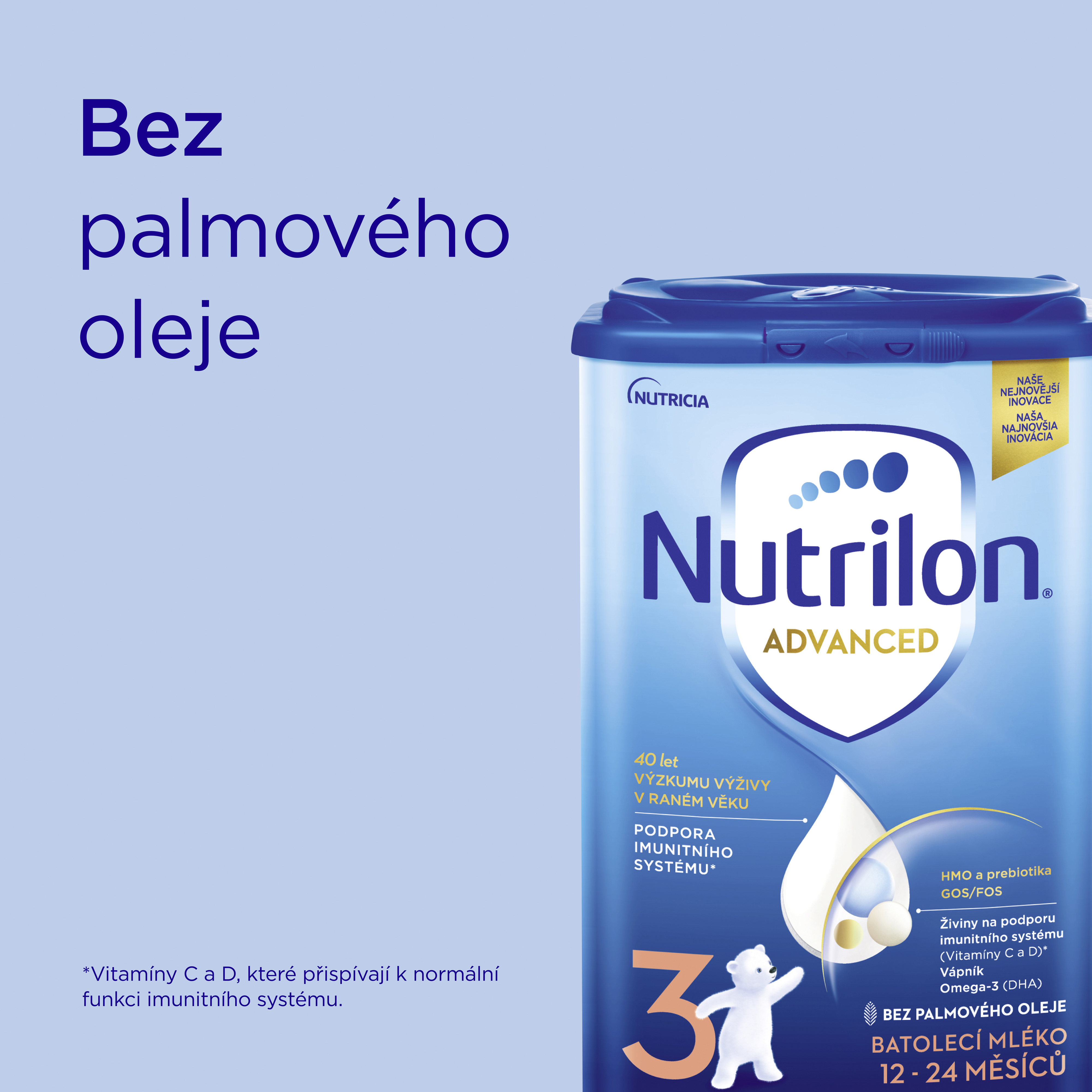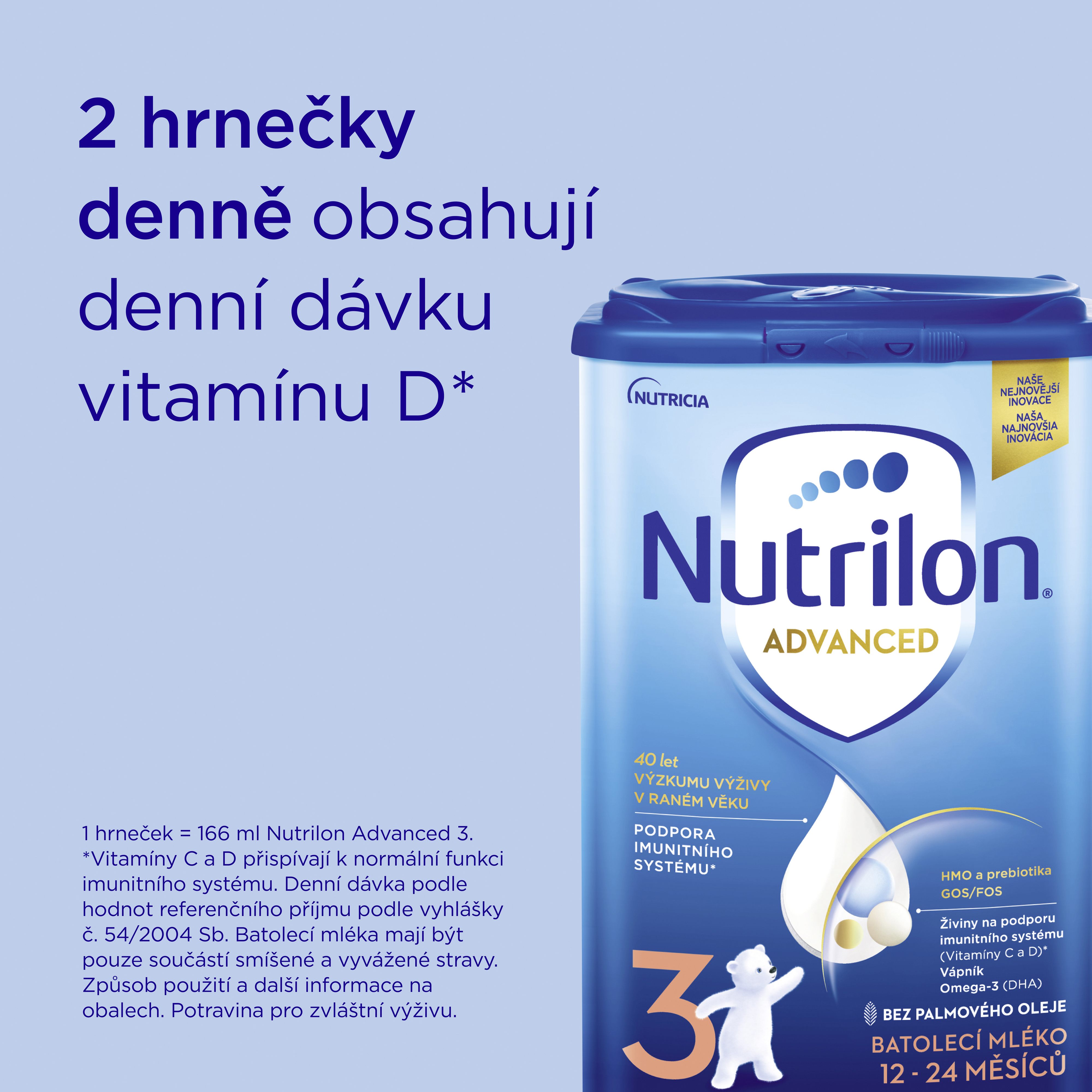 Výrobek je určen pro výživu dětí od 1 roku věku. Nutrilon 3 Advanced má být součástí smíšené a vyvážené stravy dítěte a není náhradou mateřského mléka. Pro zdraví dětí je důležité důsledné dodržování návodu na přípravu i uvedených doporučení. Nevhodné pro děti do 1 roku věku. Kojení je pro děti nejlepší. Podporujeme doporučení WHO - plné kojení v prvních 6 měsících věku a pokračování až do 2 let a dále, spolu se zaváděním bezpečné a vhodné doplňkové stravy. Mléčná výživa malých dětí, v prášku. Připravenou stravu spotřebujte do 2 hodin, poté zlikvidujte. Neohřívejte v mikrovlnné troubě, hrozí opaření dítěte. Nikdy nepřidávejte do výživy více odměrek, než je stanoveno, ani cokoliv jiného. Dohlédněte na hygienu zoubků. Pro zdraví kojenců je důležité dodržovat návod na přípravu a uvedená doporučení.