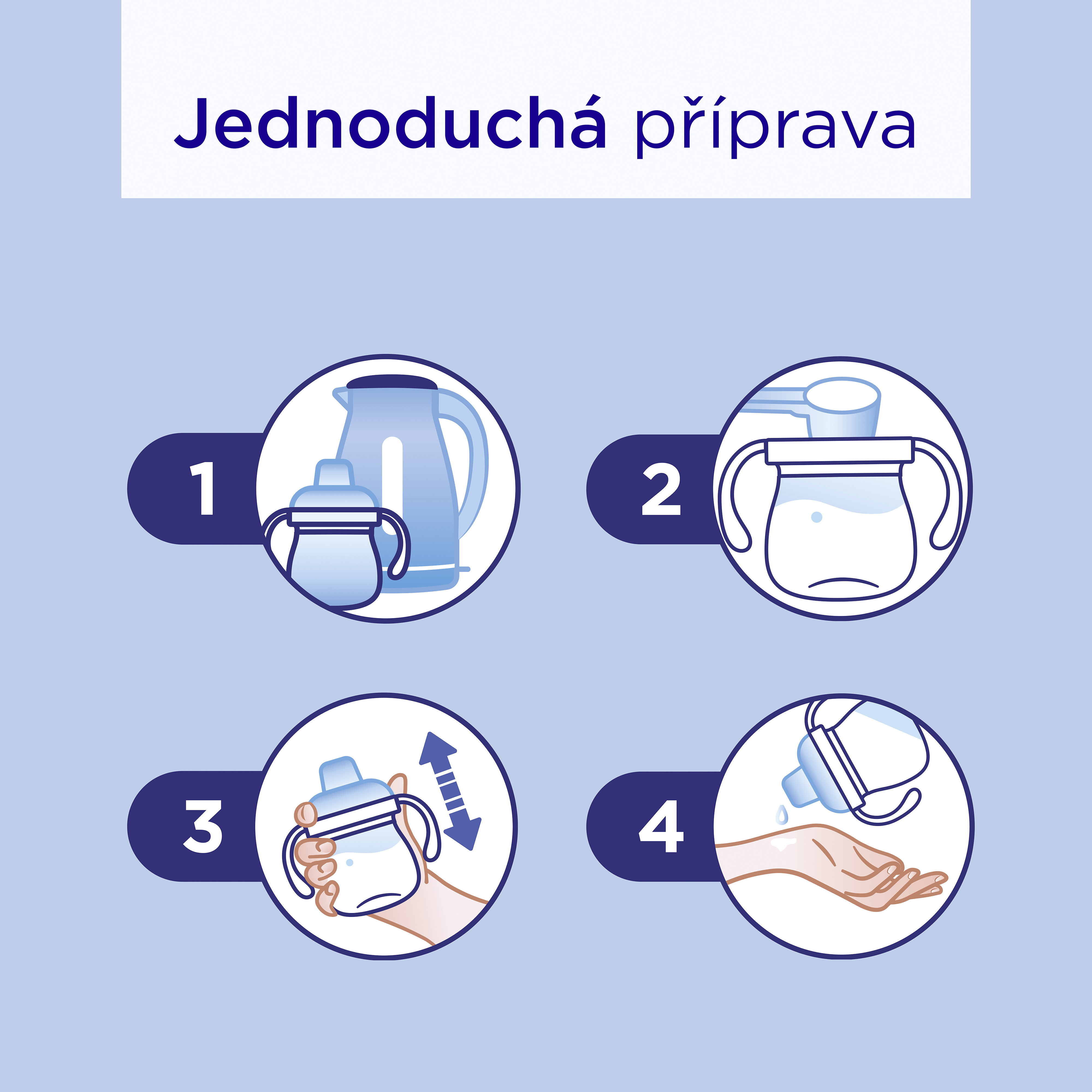 Do hrnečku s vodou přidejte odpovídající množství prášku (viz tabulka na obale). Uzavřete a 10 sekund protřepejte.
