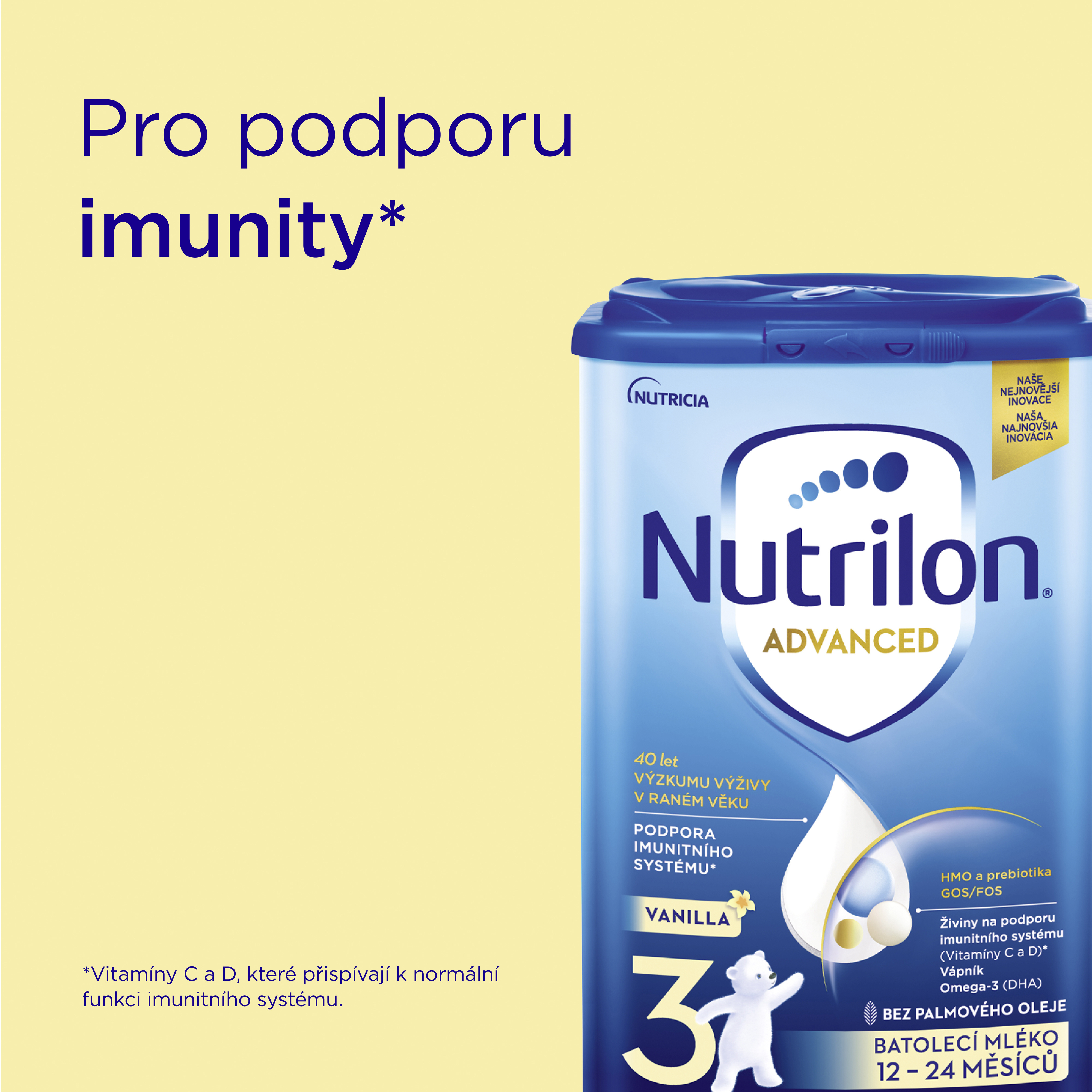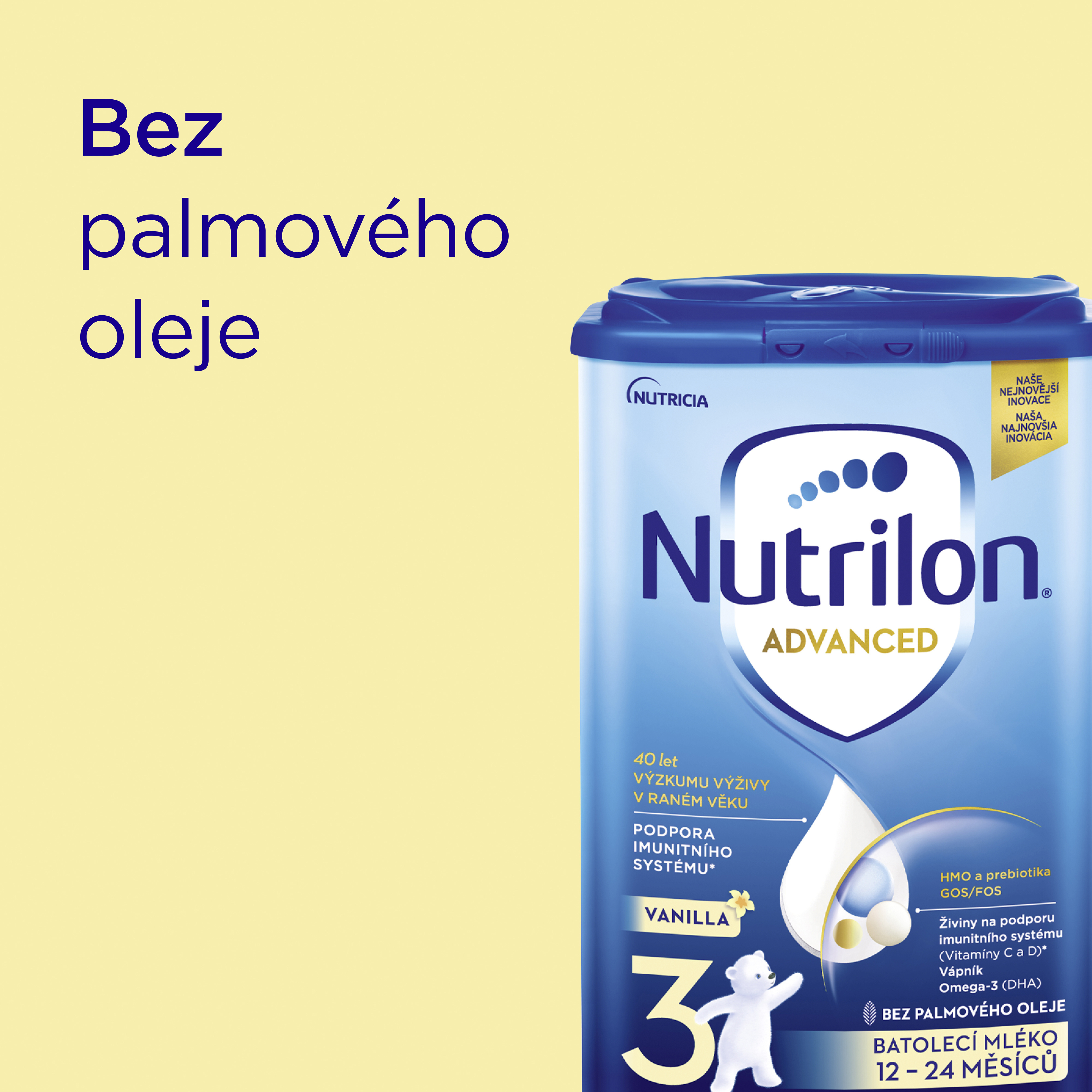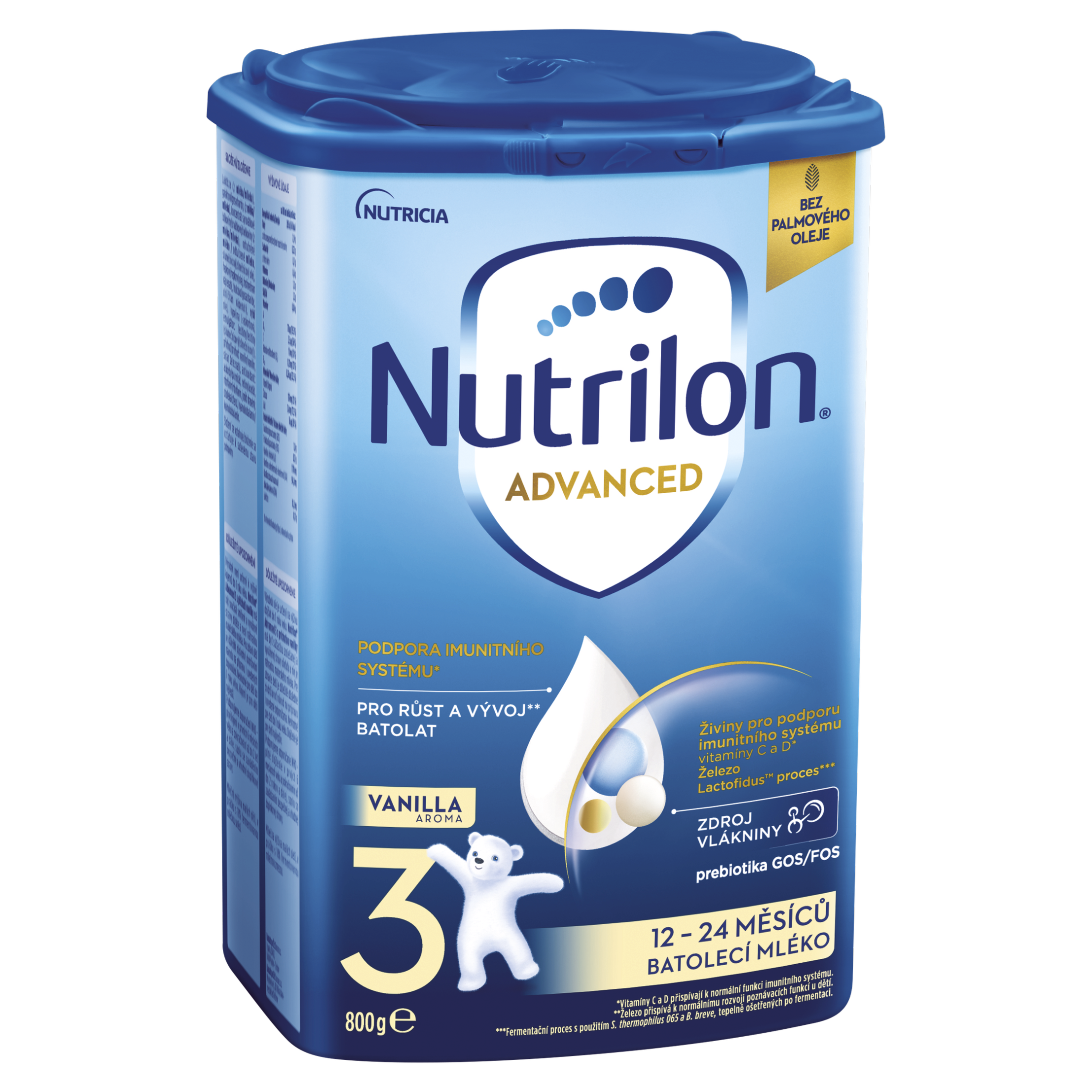 - důležité minerály – železo, jód, vápník. Mléka Nutrilon 3 Advanced pokryjí 50 % doporučeného denního přijmu železa;