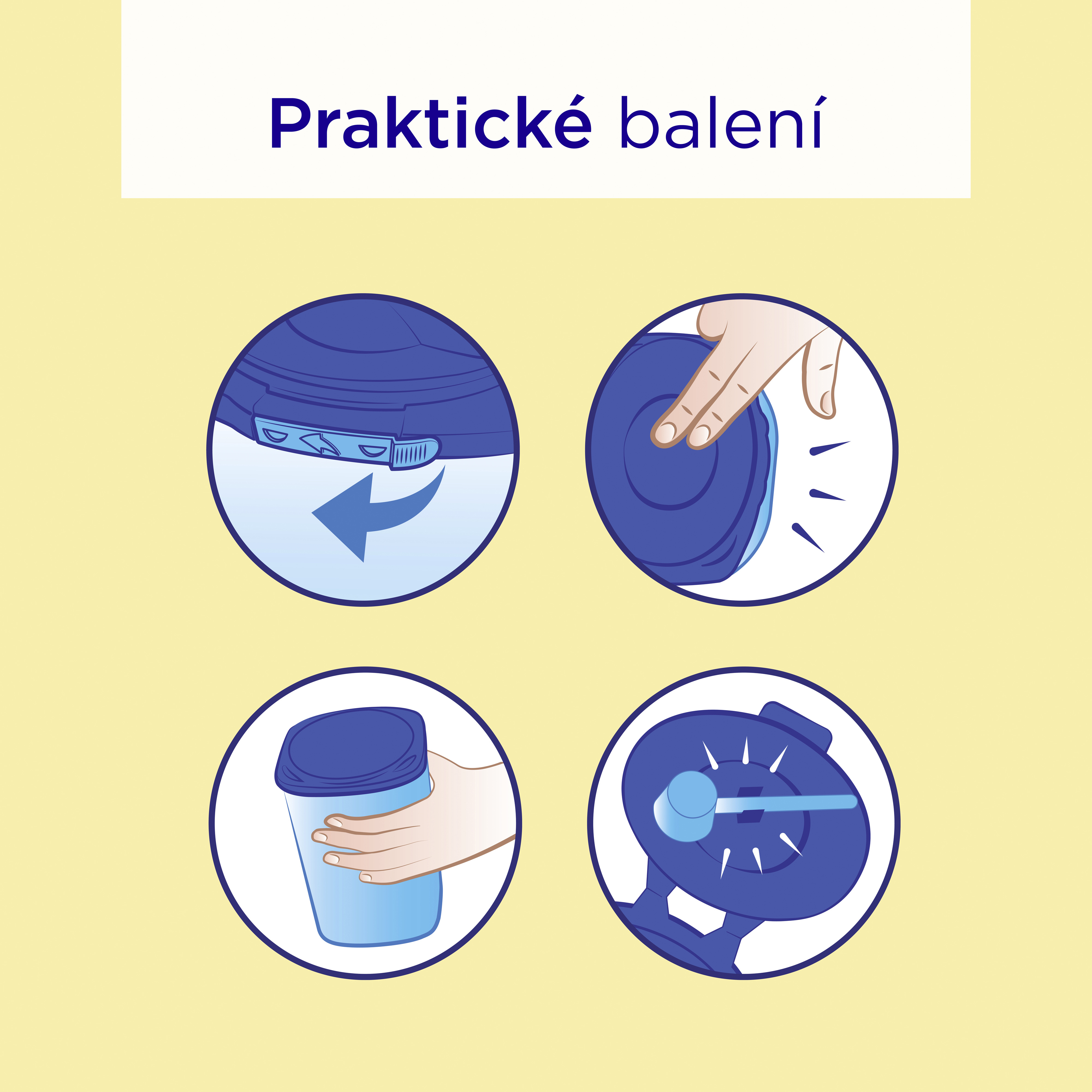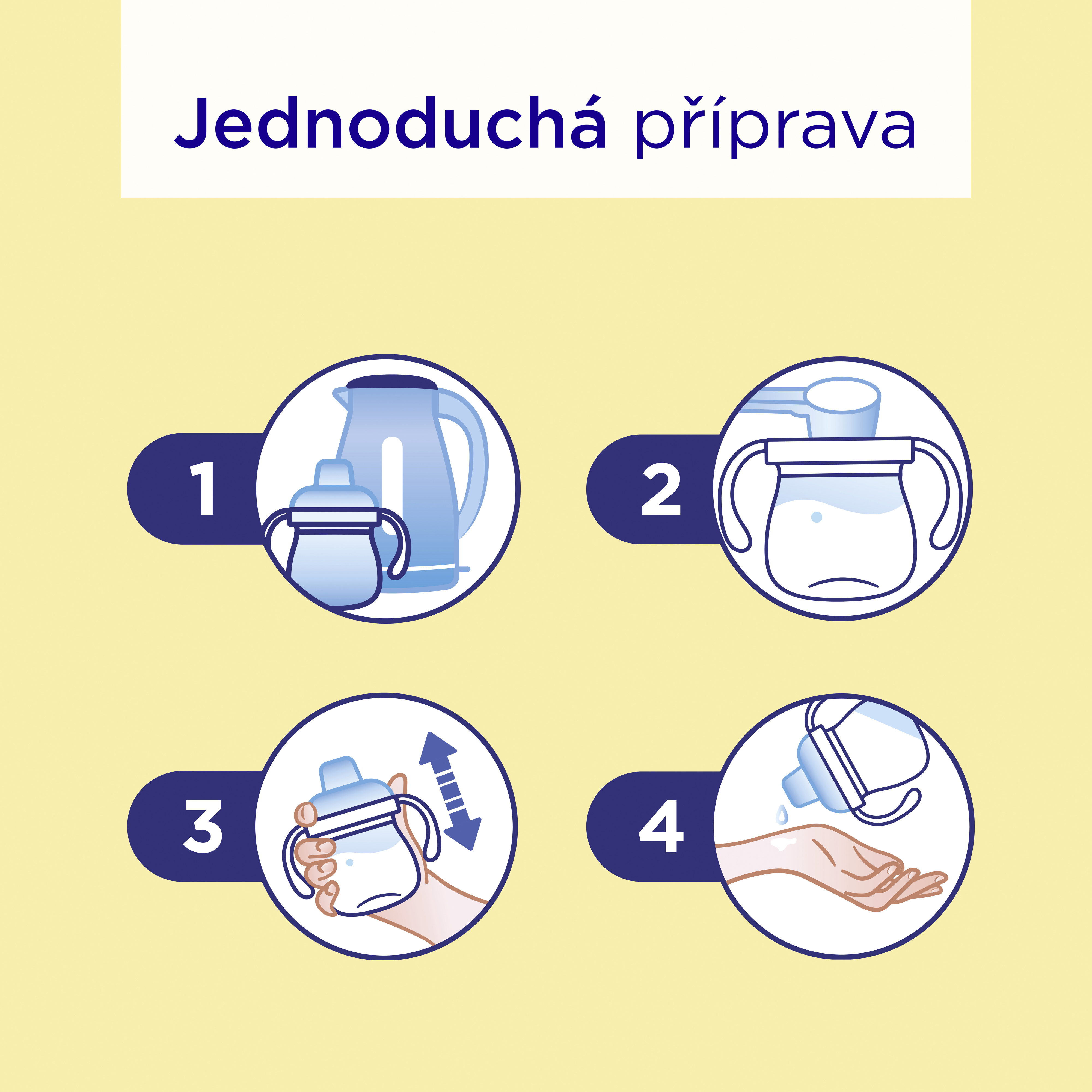 Návod na přípravu: 1. Vysterilizujte všechno používané nádobí a převařte pitnou vodu určenou pro kojence. Nechte ji v konvici vychladnout asi 30 minut na přibližně 40 °C. Odpovídající množství převařené vody (viz tabulka na obale) vlijte do vysterilizovaného hrnečku. 2. Na dávkování vždy používejte přiloženou odměrku. Prášek v ní zarovnejte pomocí speciálního plastového pásku uvnitř obalu. 3. Do hrnečku s vodou přidejte odpovídající množství prášku (viz tabulka na obale). Uzavřete hrneček a 10 sekund ho důkladně protřepejte ve svislé poloze. 4. Před podáváním ověřte teplotu mléčné směsi kápnutím na vnitřní stranu zápěstí a ihned podávejte.