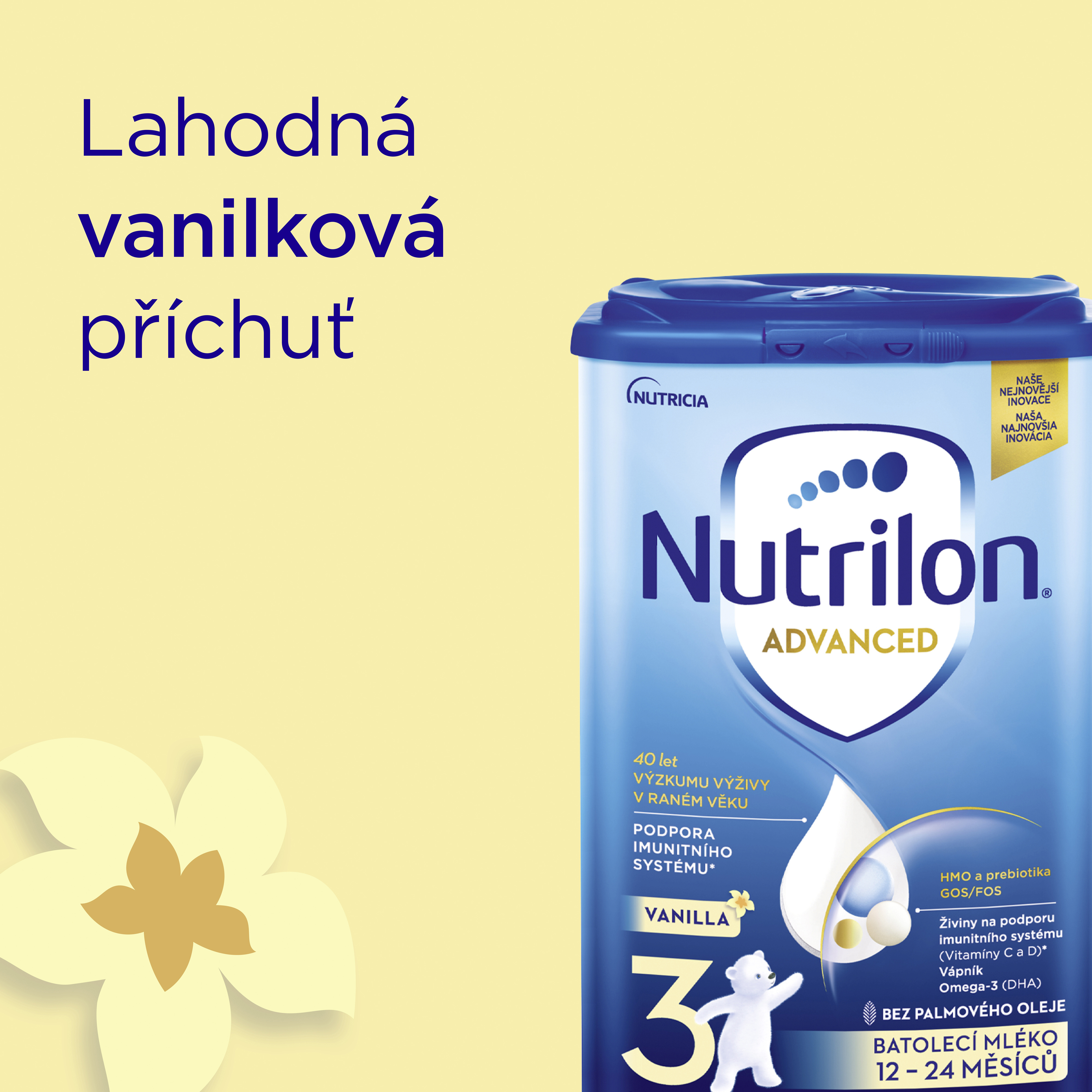 Výrobek je určen pro výživu dětí od 1 roku věku. Nutrilon 3 Advanced Vanilla má být součástí smíšené a vyvážené stravy dítěte a není náhradou mateřského mléka. Pro zdraví dětí je důležité důsledné dodržování návodu na přípravu i uvedených doporučení. Nevhodné pro děti do 1 roku věku. Kojení je pro děti nejlepší. Podporujeme doporučení WHO - plné kojení v prvních 6 měsících věku a pokračování až do 2 let a dále, spolu se zaváděním bezpečné a vhodné doplňkové stravy. Mléčná výživa malých dětí, v prášku. Připravenou stravu spotřebujte do 2 hodin, poté zlikvidujte. Neohřívejte v mikrovlnné troubě, hrozí opaření dítěte. Nikdy nepřidávejte do výživy více odměrek, než je stanoveno, ani cokoliv jiného. Dohlédněte na hygienu zoubků. Pro zdraví kojenců je důležité dodržovat návod na přípravu a uvedená doporučení.