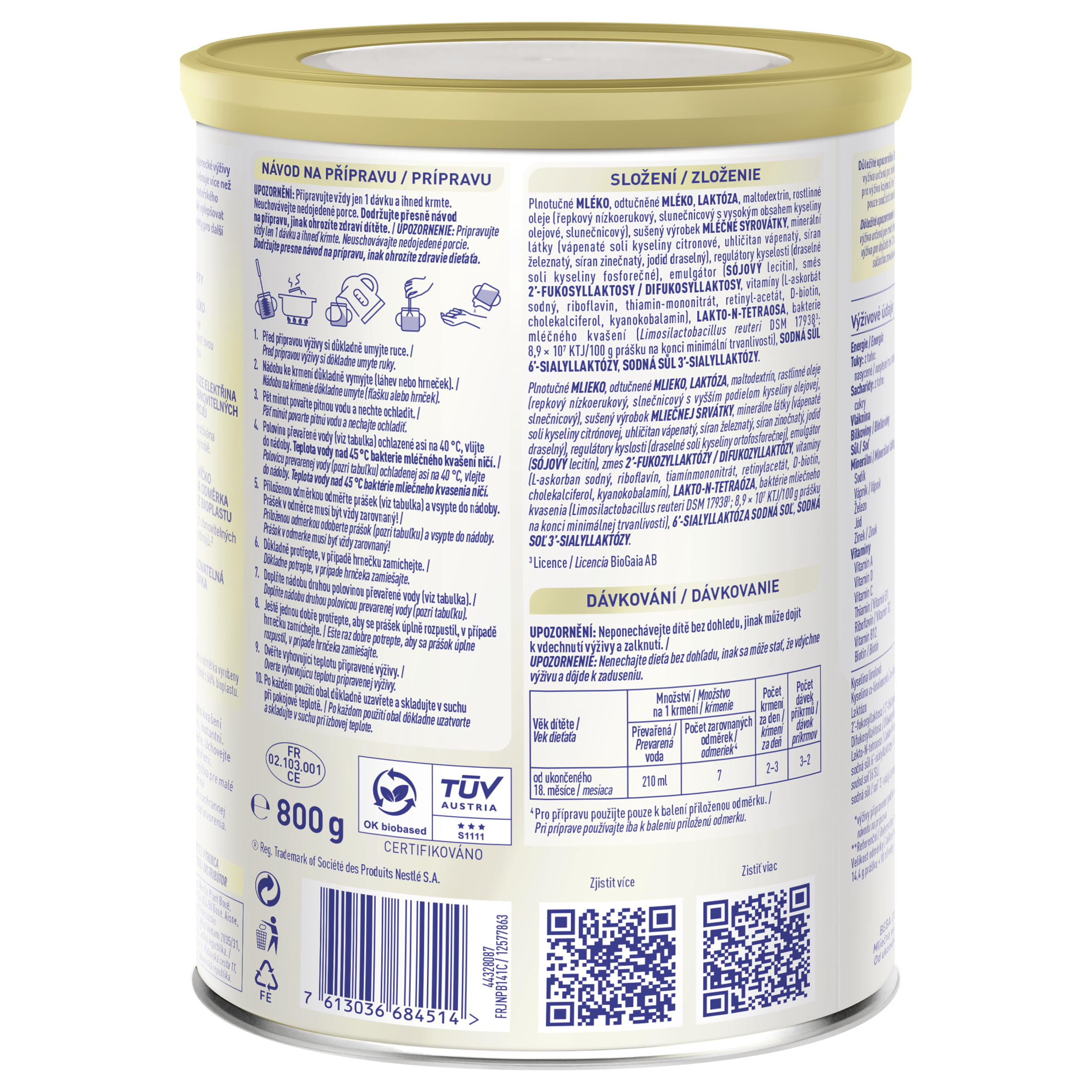 Složení: plnotučné MLÉKO, odtučněné MLÉKO, LAKTÓZA, rostlinné oleje (řepkový nízkoerukový, slunečnicový s vysokým obsahem kyseliny olejové, slunečnicový), sušený výrobek MLÉČNÉ SYROVÁTKY, minerální látky (uhličitan vápenatý, síran železnatý, síran zinečnatý, jodid draselný), emulgátor (SÓJOVÝ lecitin), regulátory kyselosti (draselné soli kyseliny fosforečné), 2´- FUKOSYLLAKTOSA, vitamíny (L-askorbát sodný, riboflavin, retinylacetát, cholekalciferol, kyanokobalamin), bakterie mléčného kvašení (Lactobacillus reuteri DSM 17938; 8,9 x 10⁷ KTJ / 100 g prášku na konci minimální trvanlivosti).