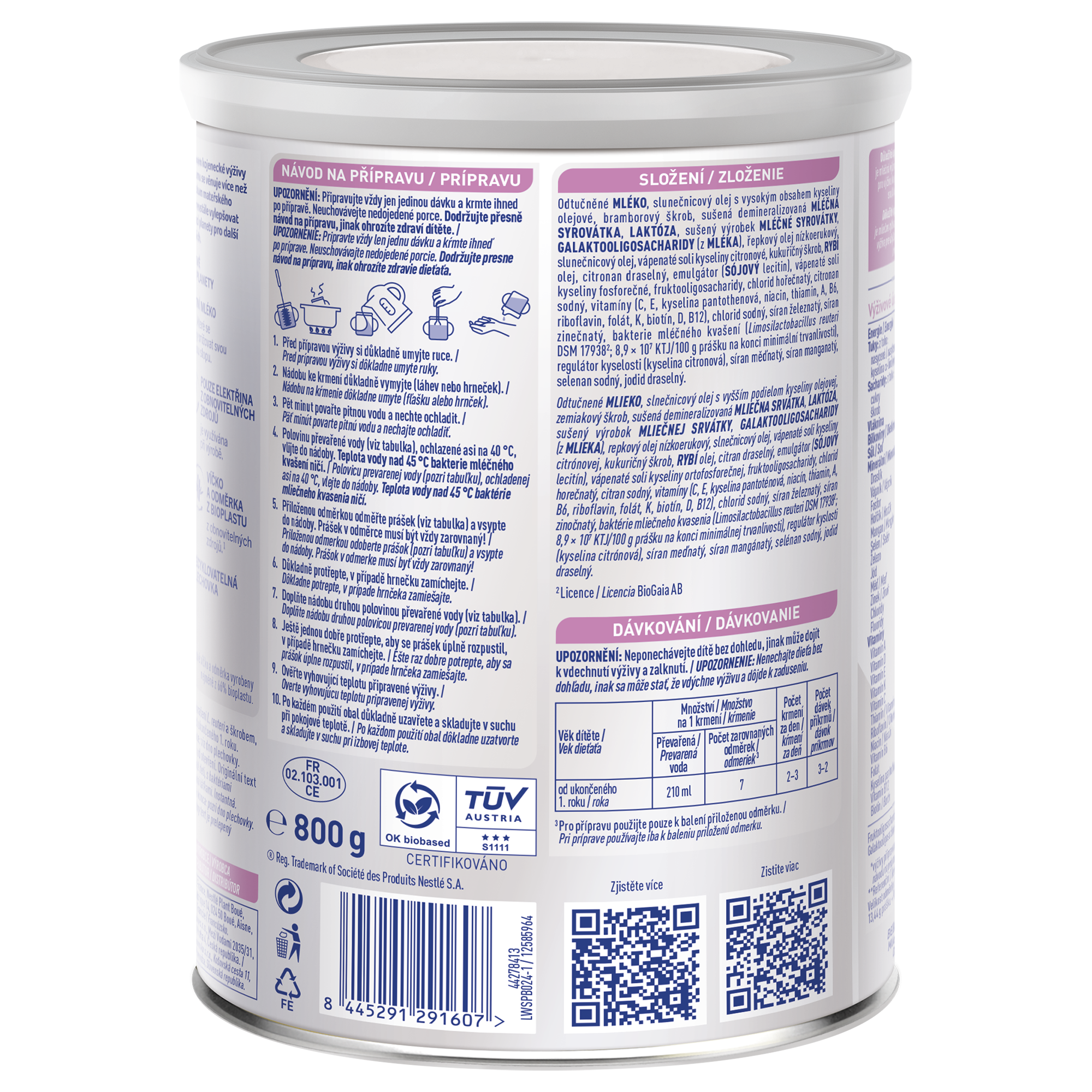 Složení: odtučněné MLÉKO, slunečnicový olej s vysokým obsahem kyseliny olejové, bramborový škrob, sušená demineralizovaná MLÉČNÁ SYROVÁTKA, LAKTÓZA, sušený výrobek MLÉČNÉ SYROVÁTKY, GALAKTOOLIGOSACHARIDY (z MLÉKA), řepkový olej nízkoerukový, slunečnicový olej, vápenaté soli kyseliny citronové, kukuřičný škrob, RYBÍ olej, citronan draselný, emulgátor (SÓJOVÝ lecitin), vápenaté soli kyseliny fosforečné, fruktooligosacharidy, chlorid hořečnatý, citronan sodný, vitamíny (C, E, kyselina pantothenová, niacin, thiamin, A, B6, riboflavin, folát, K, biotín, D, B12), chlorid sodný, síran železnatý, síran zinečnatý, bakterie mléčného kvašení (Limosilactobacillus reuteri DSM 17938²; 8,9 x 10⁷ KTJ / 100 g prášku na konci minimální trvanlivosti), regulátor kyselosti (kyselina citronová), síran měďnatý, síran manganatý, selenan sodný, jodid draselný. ²Licence BioGaia AB