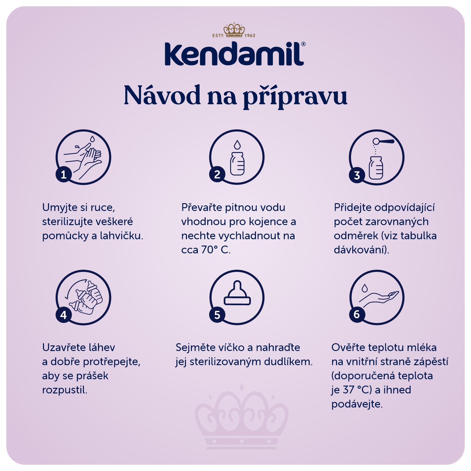 Důležité upozornění: Kojení je nejlepší způsob výživy vašeho dítěte. Kendamil Premium 3 HMO+ je určen pro výživu malých dětí od ukončeného 12. měsíce a měl by tvořit pouze součást jejich smíšené a vyvážené stravy. Při krmení z lahvičky zamezte nepotřebnému prodlužování kontaktu savičky se zoubky, zvyšujete tím riziko zubního kazu. Pečujte o hygienu ústní dutiny dítěte, především před spaním. Dodržujte pokyny pro přípravu, krmení a skladování, jinak ohrozíte zdraví dítěte. Není určeno pro děti do 12 měsíců.