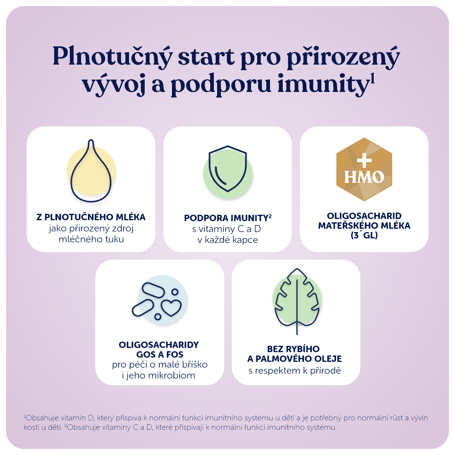 Plnotučné mléko (173 g tekutého mléka na 100 g prášku), Laktóza (z mléka) sušené odstředěné mléko, Rostlinné oleje (slunečnicový, kokosový, řepkový), Galaktooligosacharidy (z mléka) 2,2 %, Fosforečnan vápenatý, Mléčnan vápenatý, Hydroxid draselný, Olej z mikrořas Schizochytrium sp., Olej z Mortierella alpina, Askorban sodný, Fruktooligosacharidy 0,16 %, Citrát vápenatý, Nukleotidy (cytidin-5-monofosfát, sodná sůl uridin-5'-monofosfátu, adenosin-5'-monofosfát, sodná sůl inosin-5'-monofosfátu, sodná sůl guanosin-5'-monofosfátu), Síran železnatý, Vitamín E, Síran zinečnatý, Niacin, D-pantothenát vápenatý, Síran měďnatý, Vitamín A, Thiamin, Riboflavin, Vitamín B6, Kyselina listová, Síran manganatý, Jodid draselný, Vitamín K, Seleničitan sodný, Biotin, Vitamín D3, Vitamín B12, Regulátor kyselosti (kyselina citronová), Složení se vztahuje k sušenému stavu potraviny