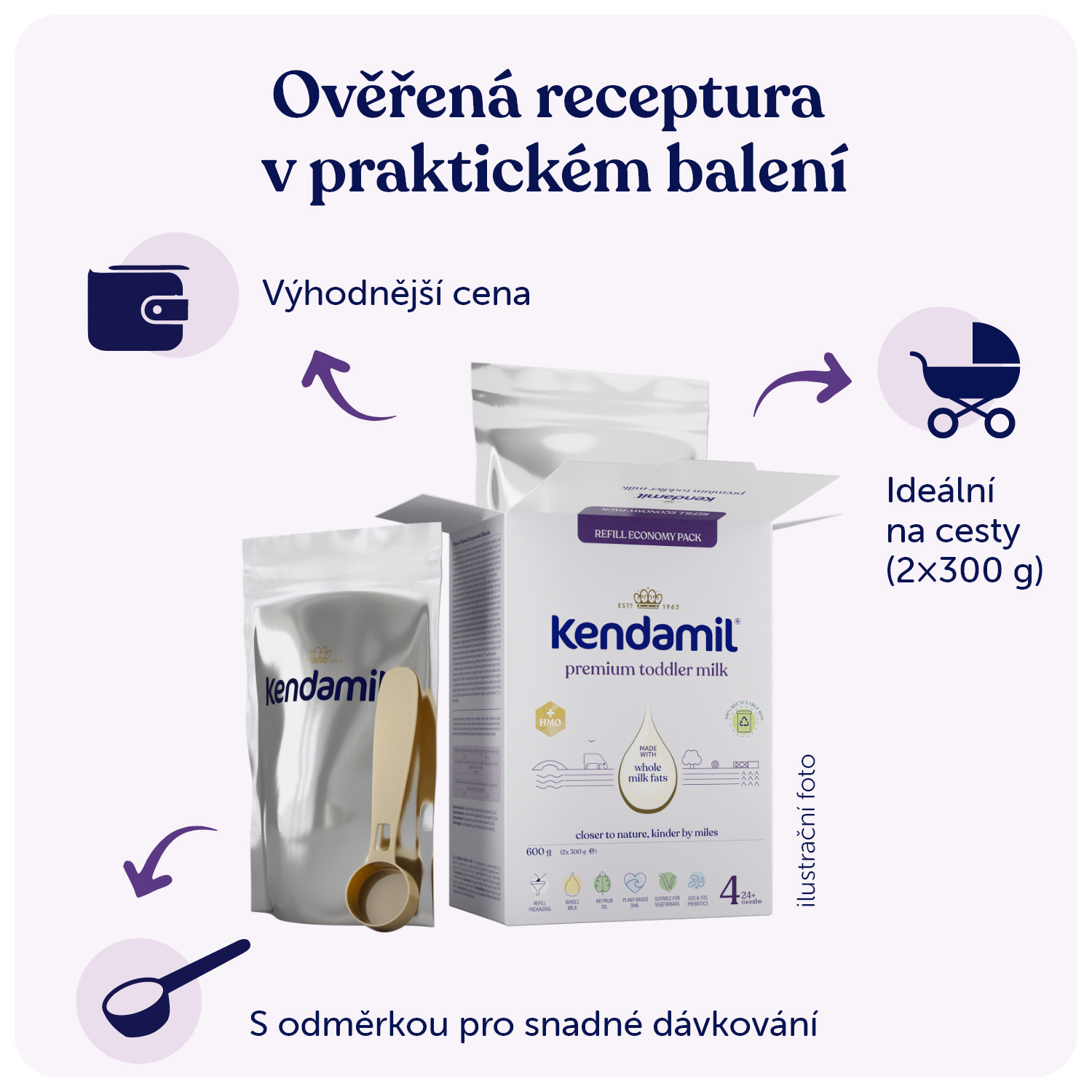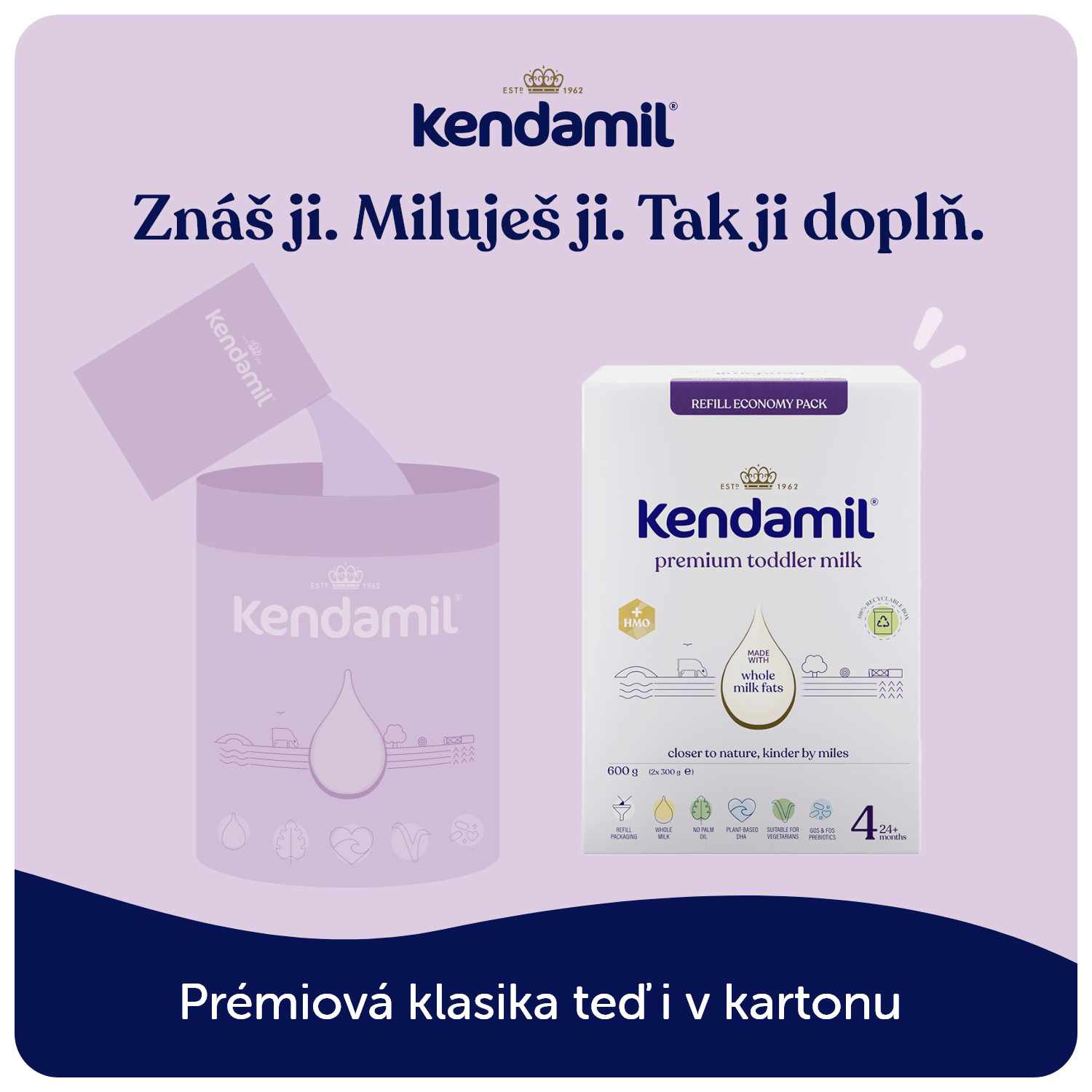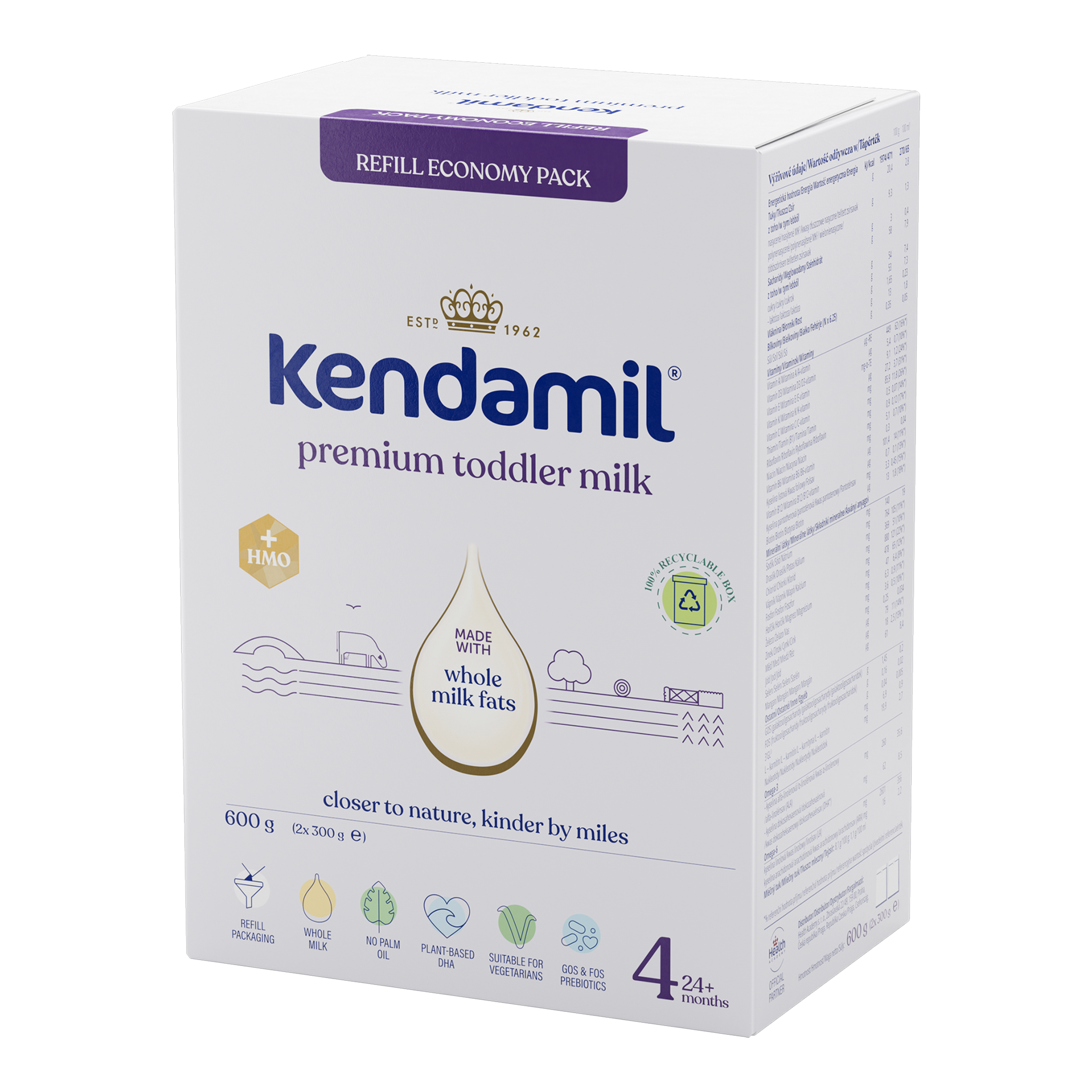 Mléčná výživa v prášku. Potravina pro zvláštní výživu od ukončeného 24. měsíce. Nová vylepšená receptura s oligosacharidem mateřského mléka HMO (3´GL) a prebiotiky (GOS a FOS) vznikla na základě 60letého výzkumu a vývoje. Kojenecké mléko Kendamil Premium je inspirováno tím nejlepším z přírody. Jeho základ tvoří především plnotučné kravské mléko s přirozeným obsahem mléčného tuku po vzoru mateřského mléka. Určeno pro děti od dvou let. Obal je plně recyklovatelný.