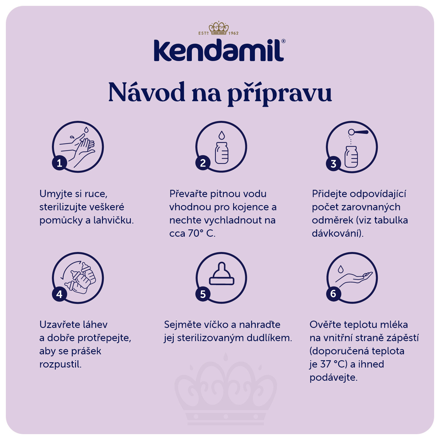Kojení je nejlepší způsob výživy Vašeho dítěte. Kendamil Premium 4 HMO+ je určen pro výživu malých dětí od ukončeného 24. měsíce a měl by tvořit pouze součást jejich smíšené a vyvážené stravy. Při krmení z lahvičky zamezte nepotřebnému prodlužování kontaktu savičky se zoubky, zvyšujete tím riziko zubního kazu. Pečujte o hygienu ústní dutiny dítěte, především před spaním. Dodržujte pokyny pro přípravu, krmení a skladování, jinak ohrozíte zdraví dítěte. Není určeno pro děti do 12 měsíců. Důležité doporučení: Po přípravě každé dávky balení pečlivě uzavřete. Nepřidávejte více nebo méně odměrek, než je stanoveno, a ani cokoliv jiného. Připravenou stravu spotřebujte do 2 hodin, poté ji zlikvidujte. Neohřívejte v mikrovlnné troubě, hrozí opaření dítěte.