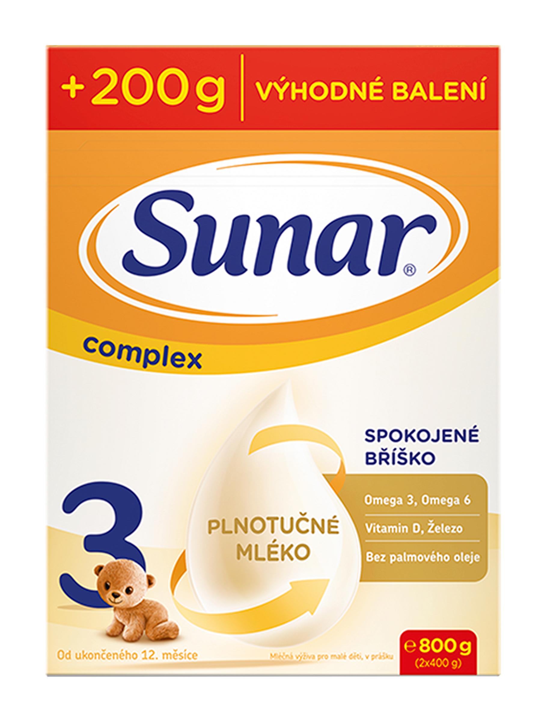 Sunar Complex 3 je batolecí mléko z plnotučného mléka, bez palmového oleje. Vyvinuto podle vzoru mateřského mléka. Je určeno pro děti od ukončeného 12. měsíce a obsahuje unikátní kombinaci látek přirozeně se vyskytujících v mateřském mléce. Mléčná výživa pro malé děti pro spokojené bříško. Sunar Complex 3 byl vyvinut po vzoru mateřského mléka a obsahuje unikátní kombinaci živin, které se v mateřském mléce přirozeně vyskytují. Plnotučné mléko, ze kterého je Sunar Complex vyroben, dodává mléku lahodnou chuť, a proto je dětmi velmi dobře přijímáno a mají spokojené bříško.