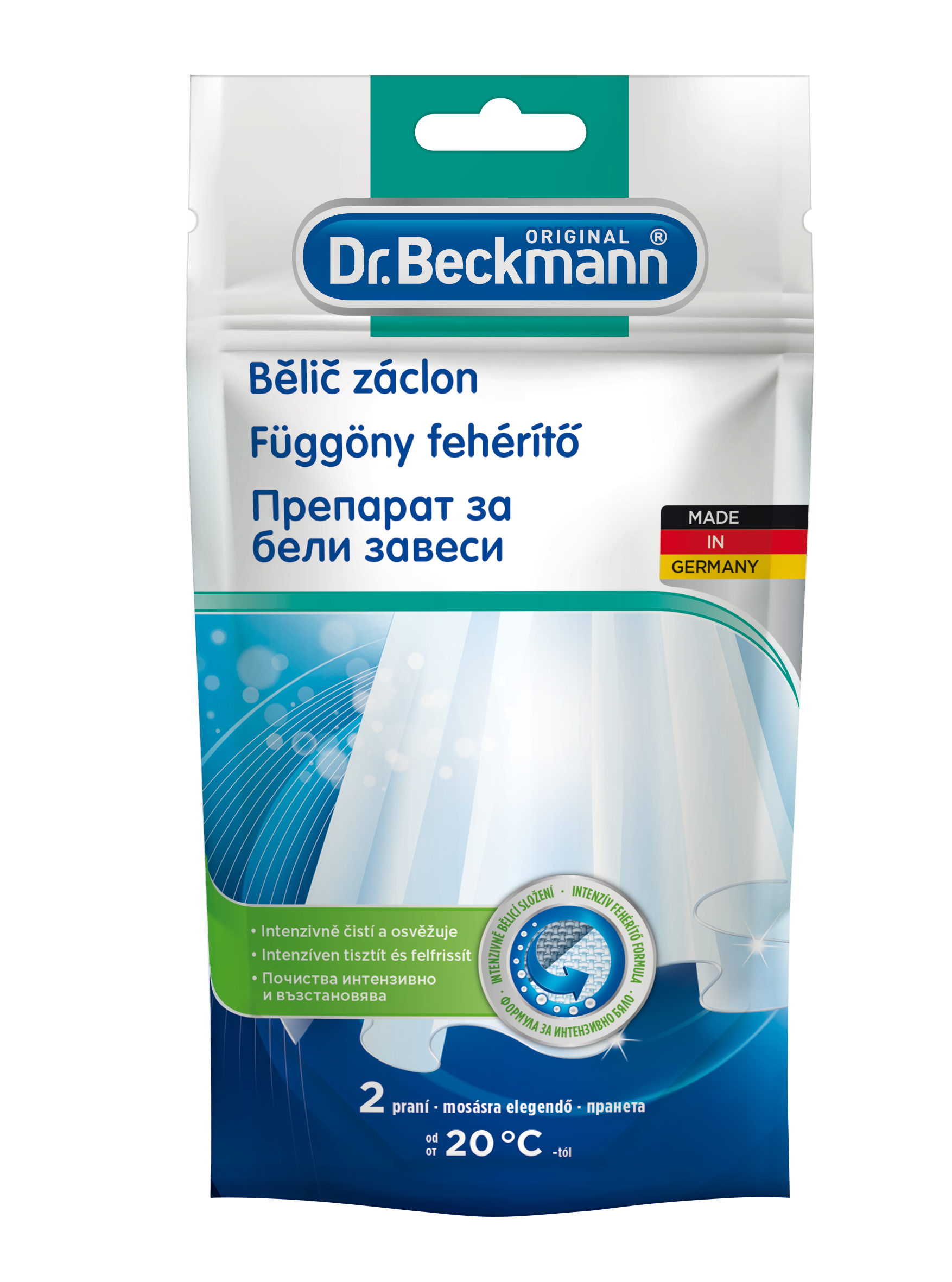 Dr. Beckmann bělič záclon spolehlivě odstraňuje všechny nečistoty a pachy a zanechává vaše záclony zářivě bílé. V uzavíratelném doypacku.
