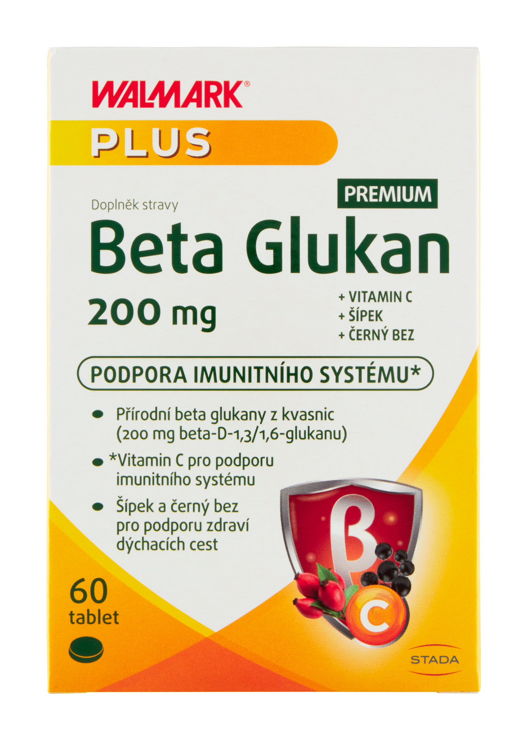 Walmark Beta glukan 200 mg Premium: Vysoká dávka beta glukanu, šípku a vitaminu C. Složení obohaceno o extrakt z plodů černého bezu. Akutní podpora imunitního a respiračního systému. Vhodné během období se zvýšeným výskytem nachlazení . Vyrobeno držitelem cetifikátu GMP.