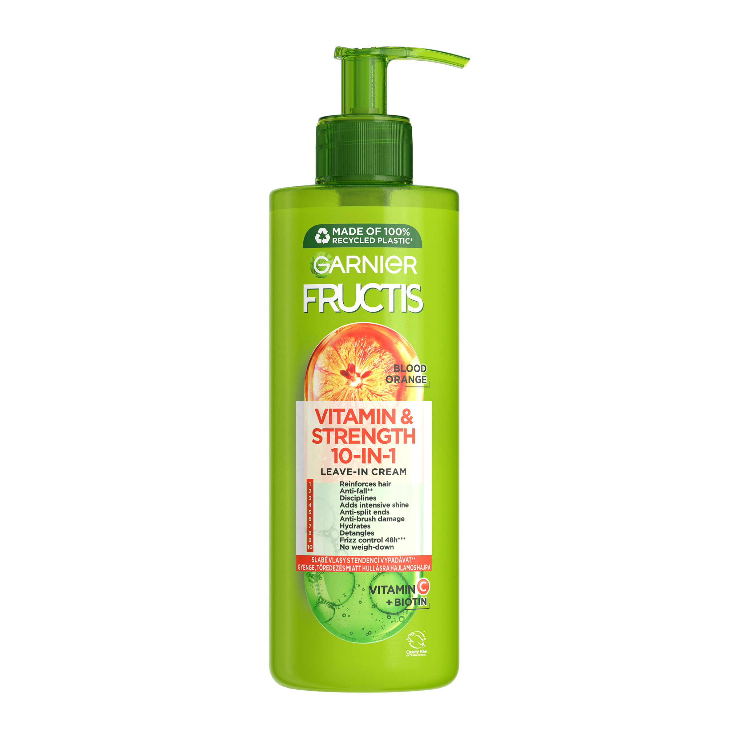 Ve své víceúčelové receptuře bezoplachové péče spojuje Fructis výtažky z červeného pomeranče s derivátem vitaminu C a biotinem pro posílení vlasů, snížení jejich vypadávání kvůli lámavosti a lepší poddajnost a úpravu. Posilující 10v1 bezoplachová péče pro slabé vlasy s tendencí vypadávat kvůli lámavosti.
