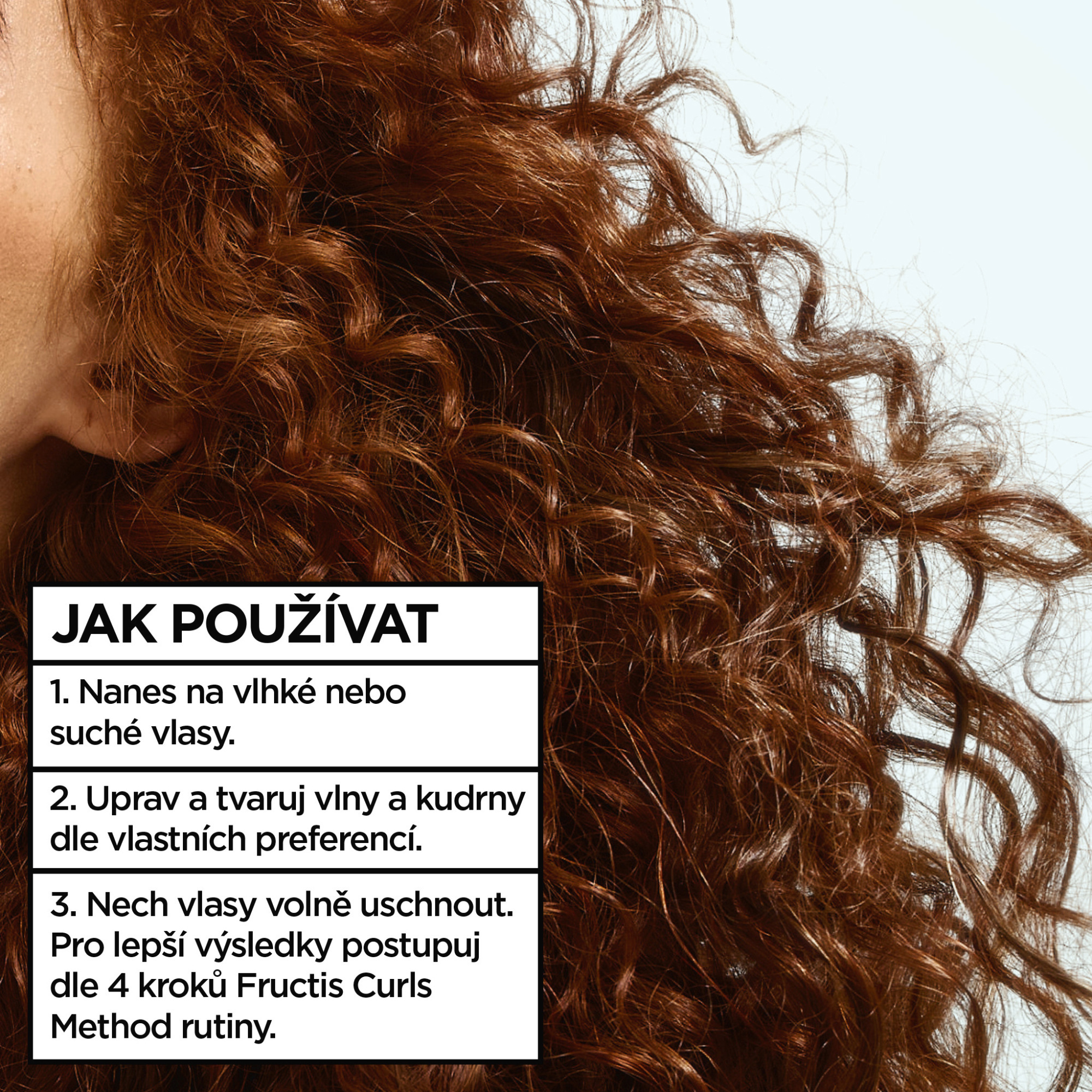 Nanes na vlhké nebo suché vlasy. Tvaruj a upravuj kadeře dle libosti. Nech vlasy přirozeně uschnout. Neoplachuj. Pro lepší výsledky postupuj dle 4 kroků Fructis Curls Method rutiny. V případě přímého kontaktu s očima je ihned a důkladně vypláchněte vodou.
