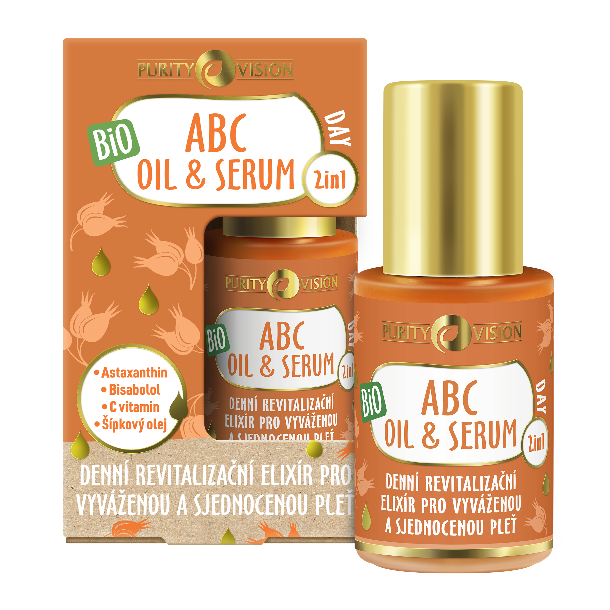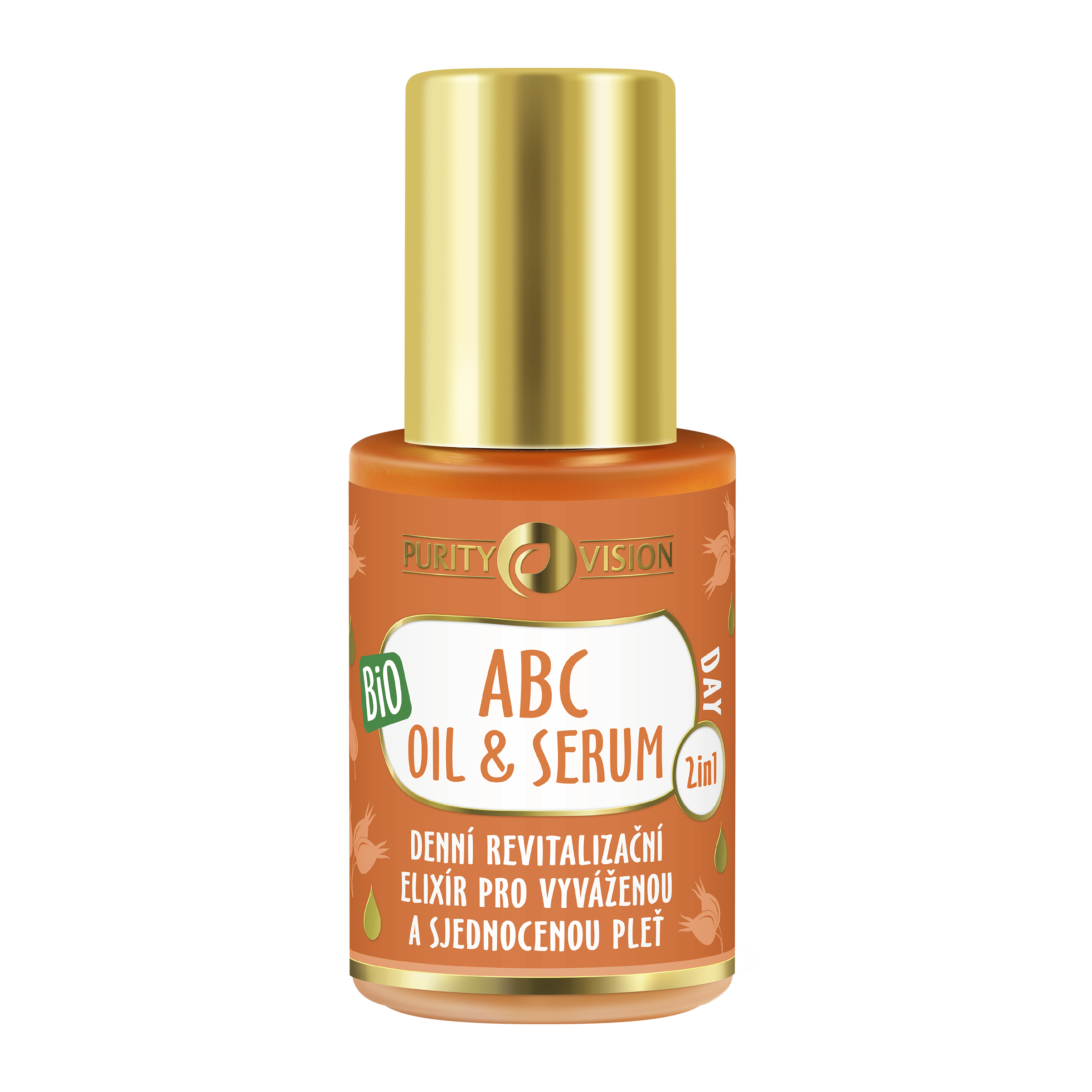 Purity Vision BIO ABC Day Oil & Serum 2v1 je výživný pleťový olej s lehkostí séra pro každodenní péči, který dodává pleti okamžitý jas a dlouhodobou ochranu. Díky kombinaci přírodních olejů a aktivních látek pomáhá sjednotit tón pleti, redukovat pigmentové skvrny a podpořit její přirozenou vitalitu. Pleť zůstává viditelně rozjasněná, hebká a svěží po celý den.