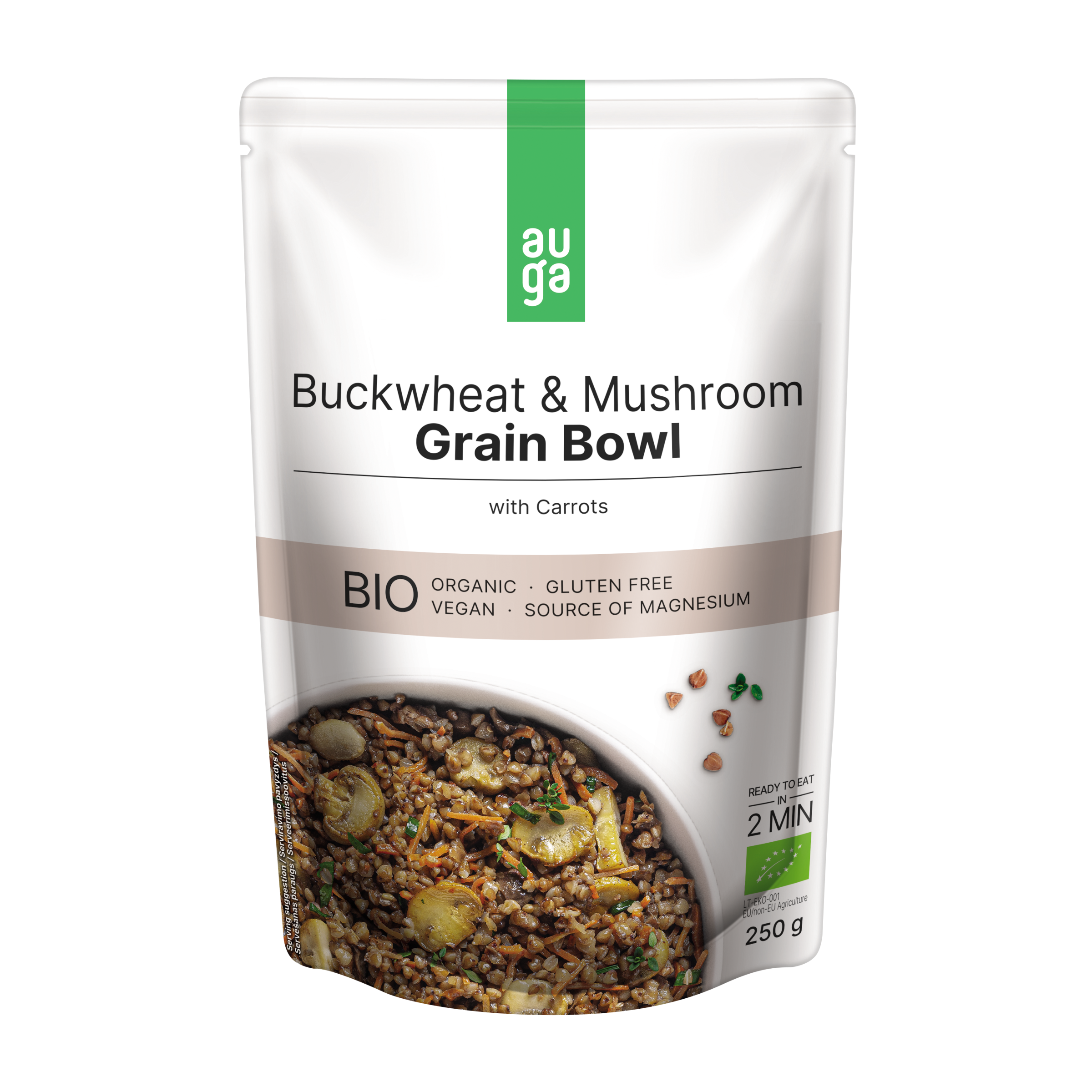 Také jste se nechali unést vlnou populárních "misek" plných nutričně vyvážených potravin a milionu chutí alias poke bowls a zároveň ne vždy máte čas na jejich přípravu? S Auga organic máte vyhráno. Obsah sáčku stačí jen dle návodu ohřát a během chvíle máte na stole výtečný pokrm ze 100% BIO surovin, a to pohanky, hub a mrkve. Pochutnáte si na něm ať jste vegan, či nikoliv.
