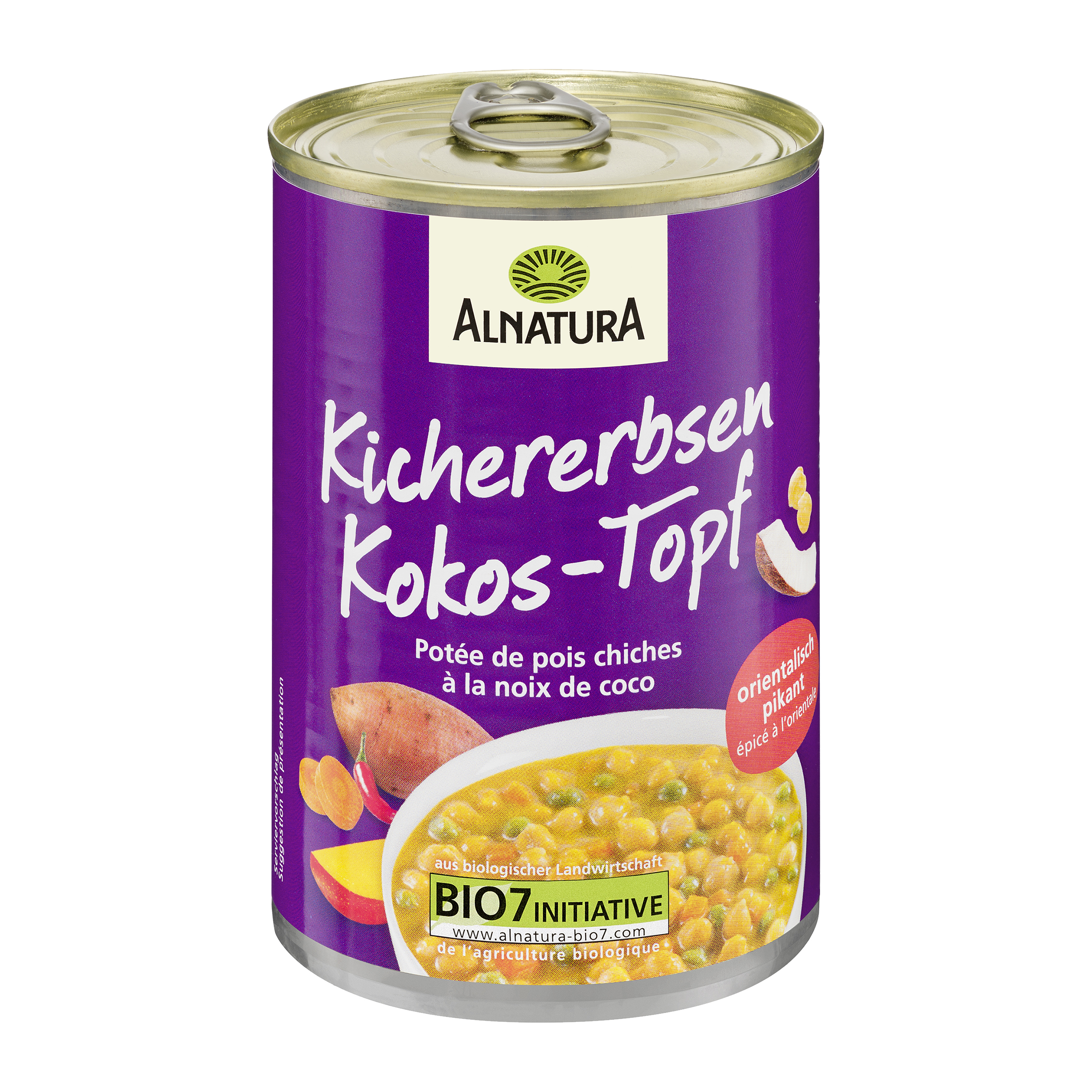 Vegetariánský guláš s cizrnou, kokosovým mlékem, sladkými bramborami, zeleninou a mnoha druhy orientálního koření. Rychlá a snadná příprava: Alnatura Cizrnový kokosový guláš krátce zahřejte v hrnci, nevařte.