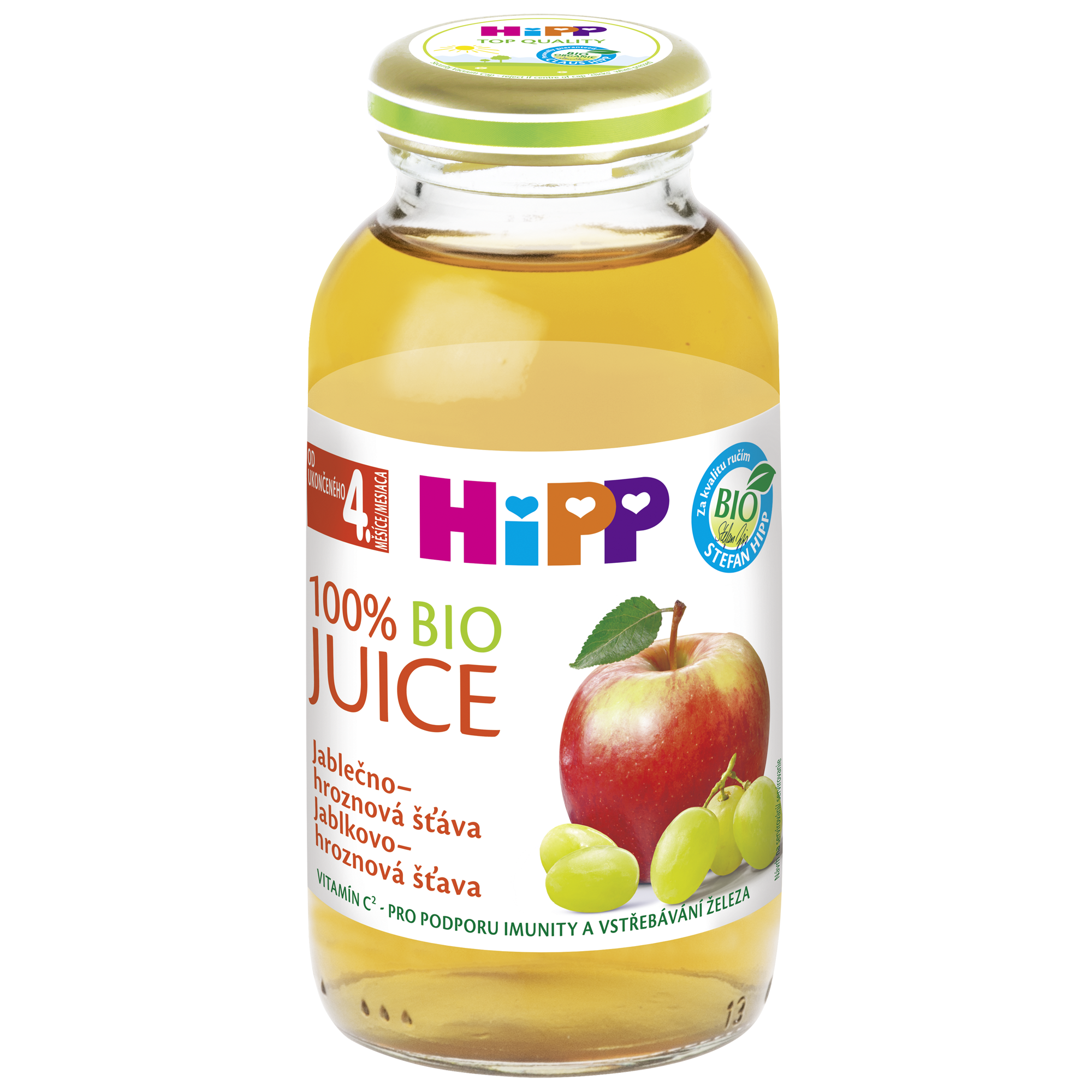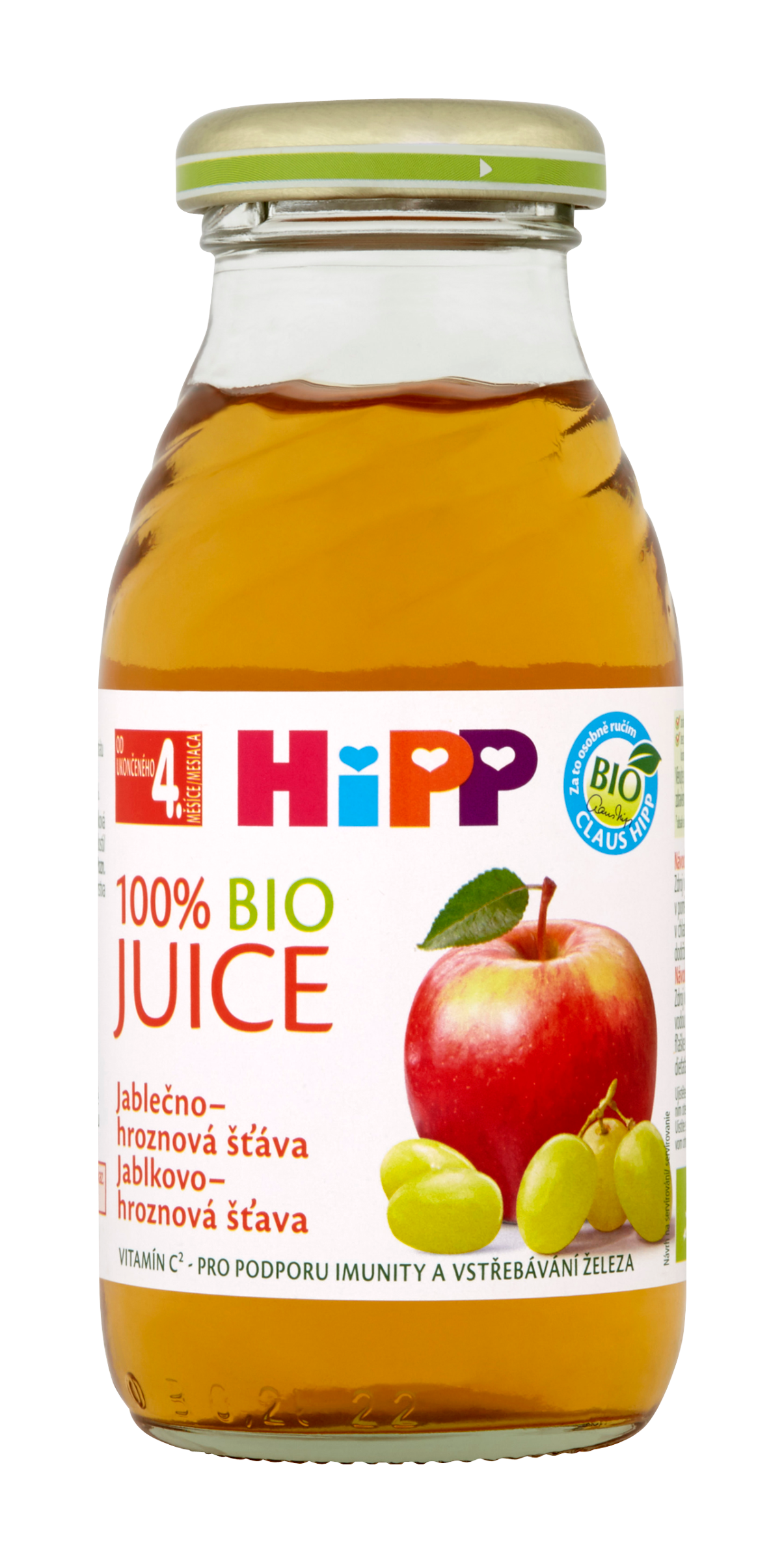 100 % ovocná jablečno-hroznová šťáva s nižším obsahem kyselin je vhodná pro citlivý dětský organismus. Šťávy jsou ideálním nápojem k příkrmům. Obsahují totiž vitamin C, který podporuje příjem železa ze zeleninových a obilných pokrmů. Slouží k uhašení žízně, můžete zředit kojeneckou vodou (1/3 šťáva a 2/3 vody).
