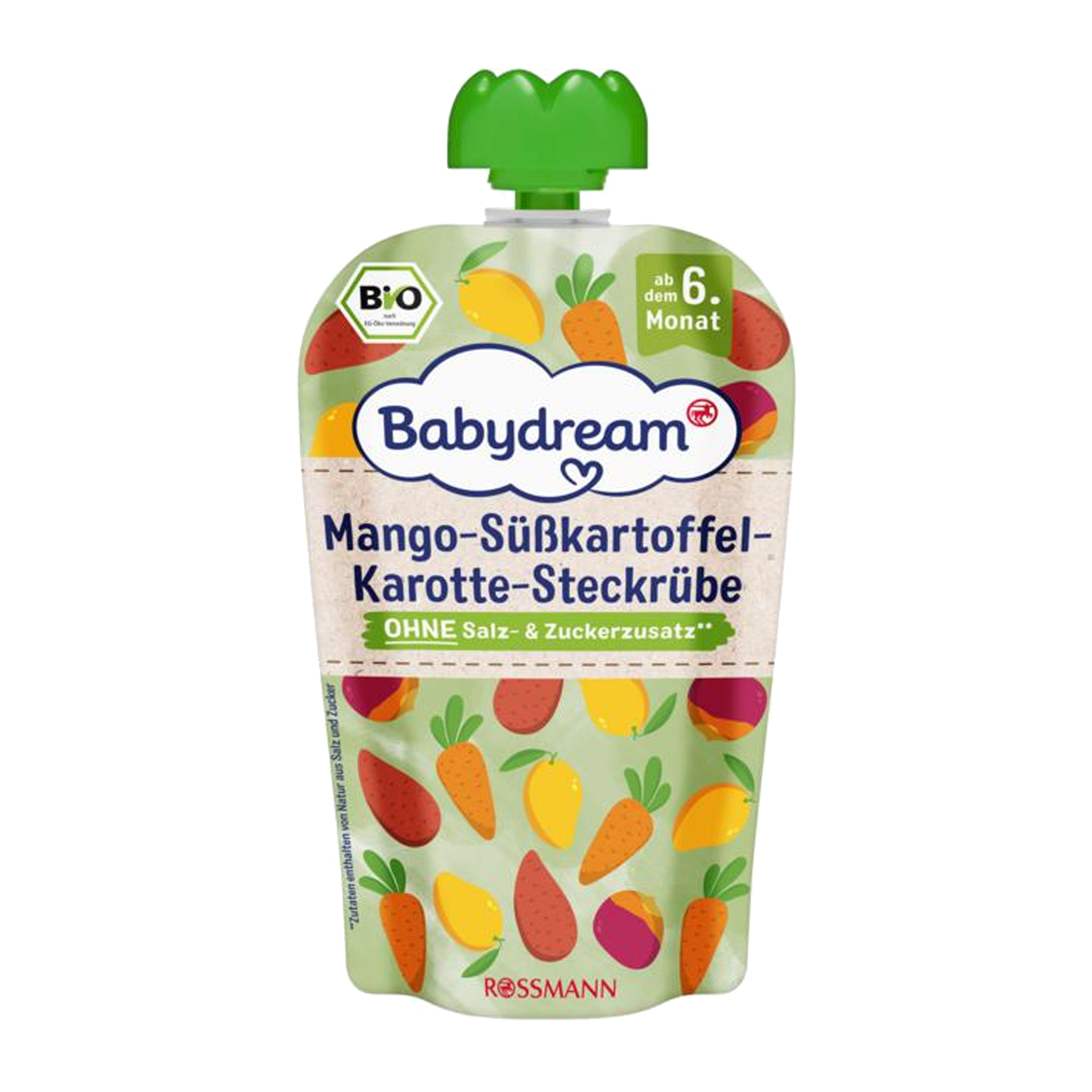 Mangové pyré * 34 %, pyré ze sladkých brambor * 30 %, mrkvové pyré * 30 %, pyré z tuřínu * 5 %, citronová šťáva *