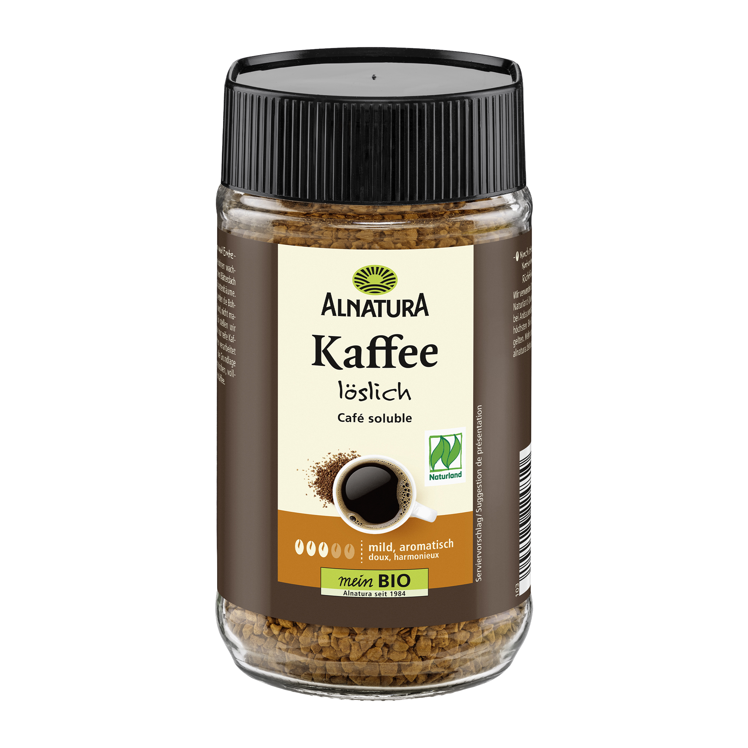 Rozpustná organická káva z vybraných zrn Arabiky a Robusty, sušená mrazem, která si uchovává aroma a má jemnou chuť. Zrna pocházejí z férových partnerství s malými farmáři a farmami.