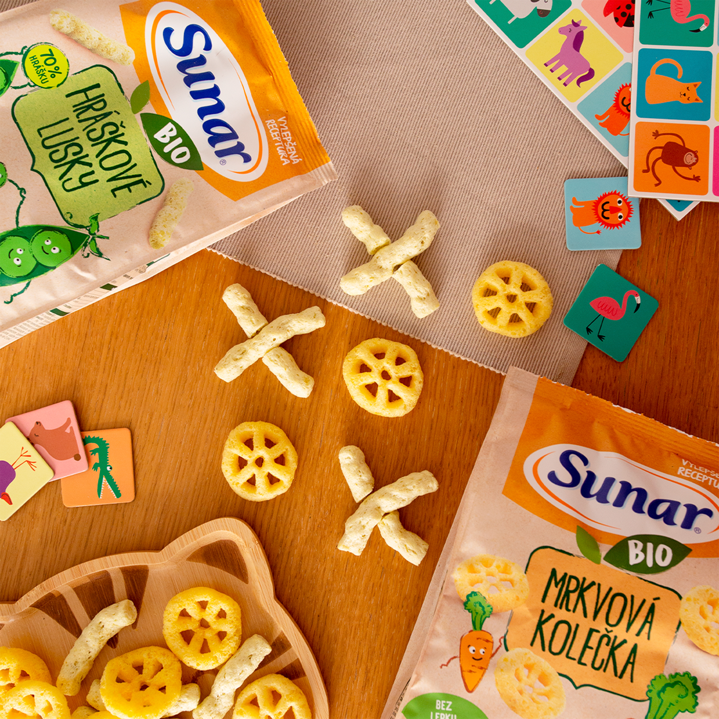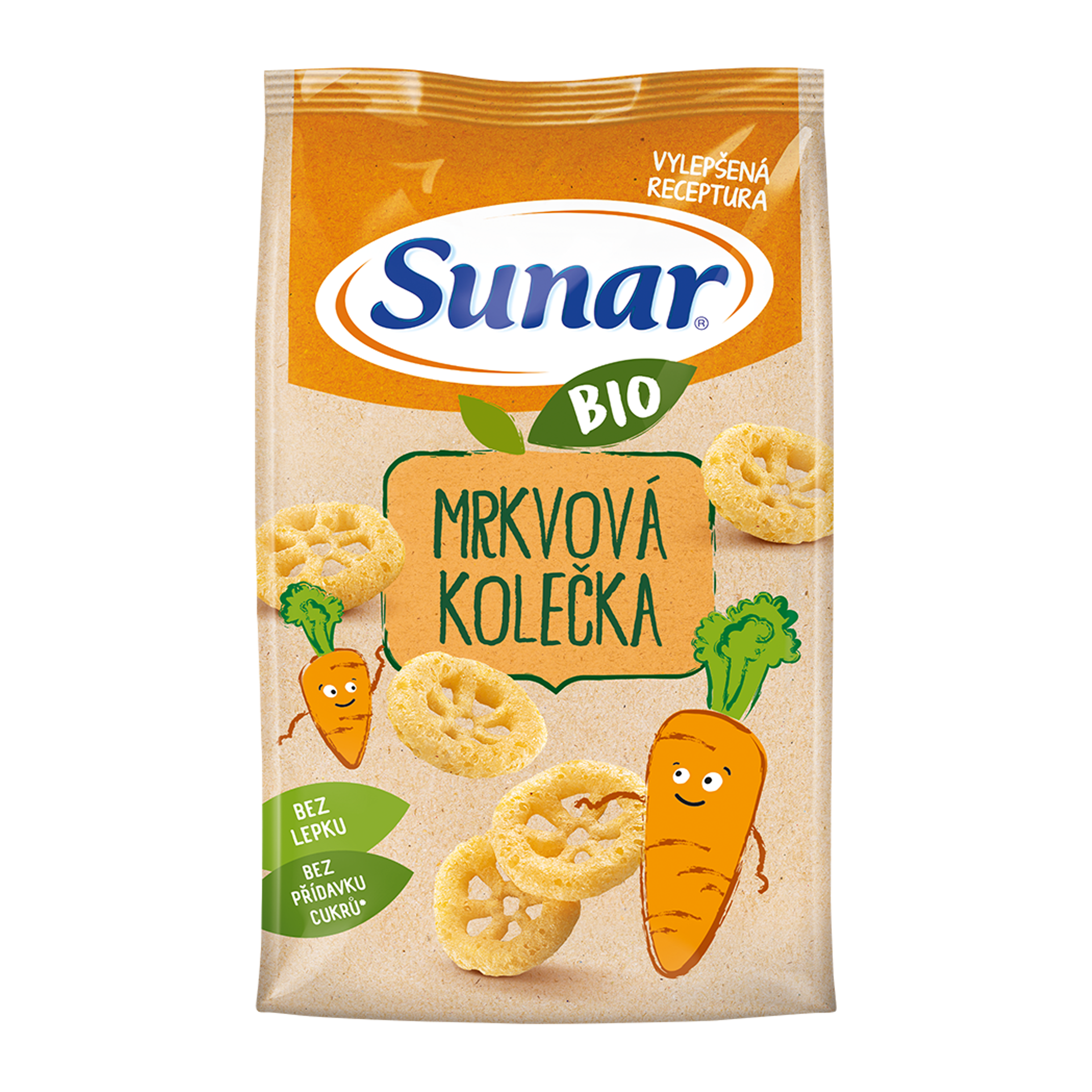 Sunar BIO mrkvové křupky jsou chutné a zdravé mlsání bez přidaného cukru a soli. Obsahují BIO bezlepkové obilniny a zeleninu. Vhodné pro děti od uk. 12. měsíce.