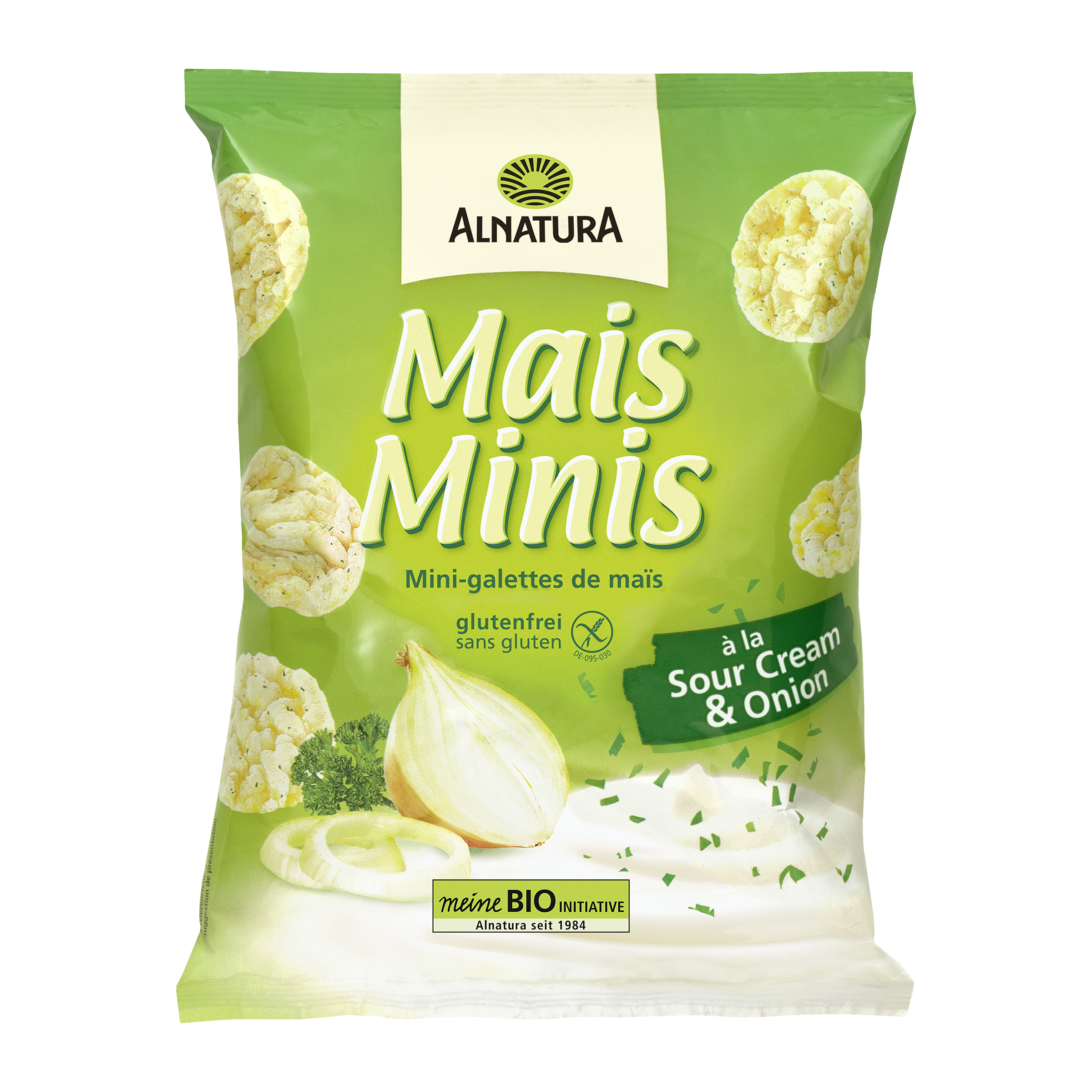 Křupavé kukuřičné mini oplatky v bio kvalitě a s pikantně svěží chutí: Alnatura Corn Minis à la Sour Cream & Onions jsou nadýchané z kukuřičných zrn a mají chuť zakysané smetany a cibule. Bezlepková svačinka pro mnoho příležitostí.