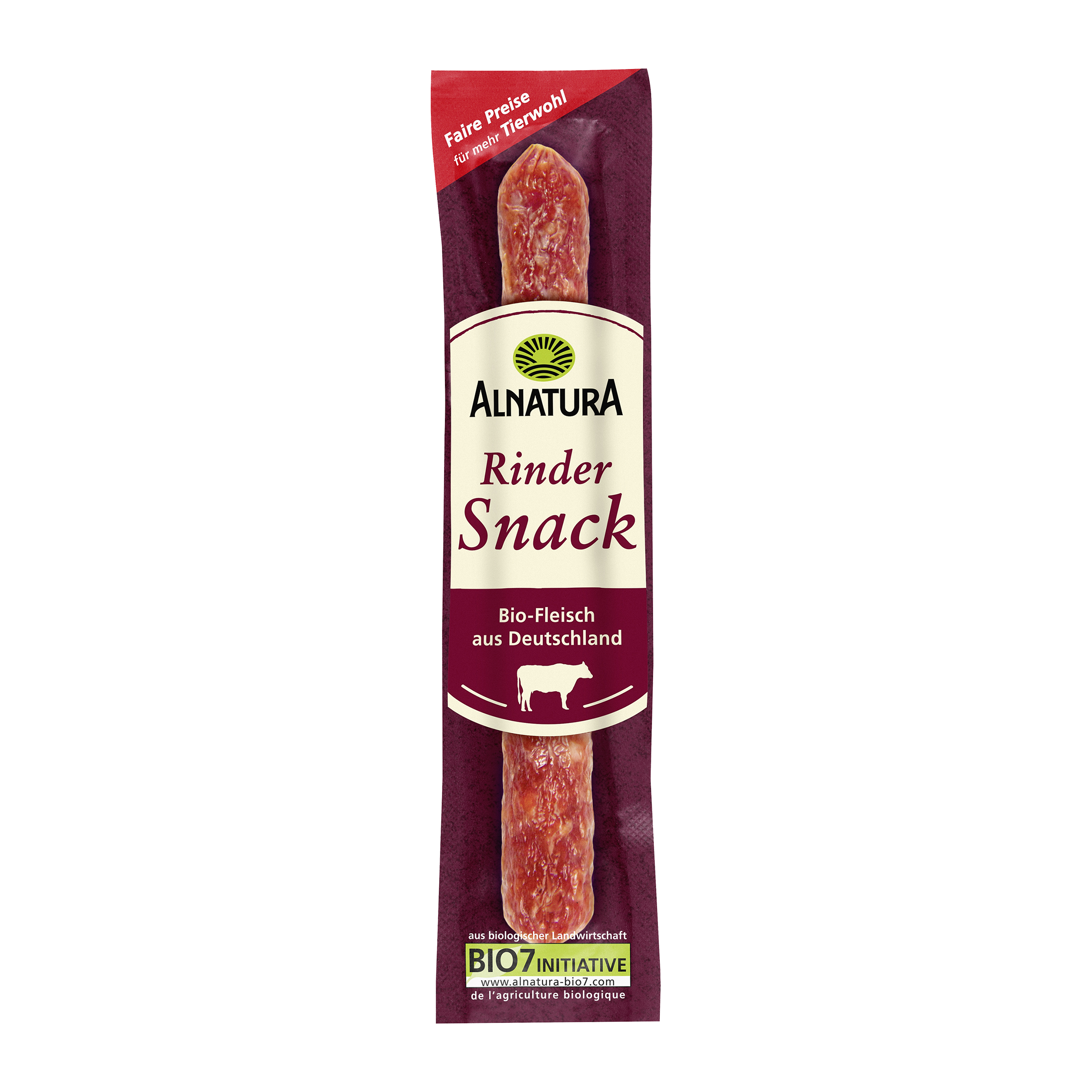 Jemně uzený salámový snack se 100 % hovězího masa. Jemně kořeněné maso pochází výhradně z německých farem, které patří do Svazu výrobců Schwäbisch Hall. Zde se věnuje zvláštní pozornost humánnímu chovu zvířat. Díky spravedlivému odměňování mohou farmáři hospodařit udržitelným způsobem. Všechny zemědělské suroviny pro hovězí snack Alnatura pocházejí z ekologického zemědělství.