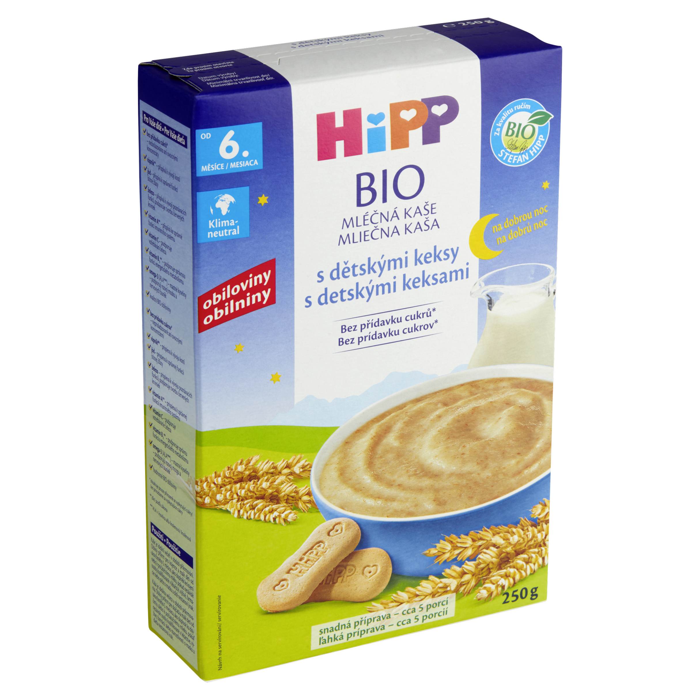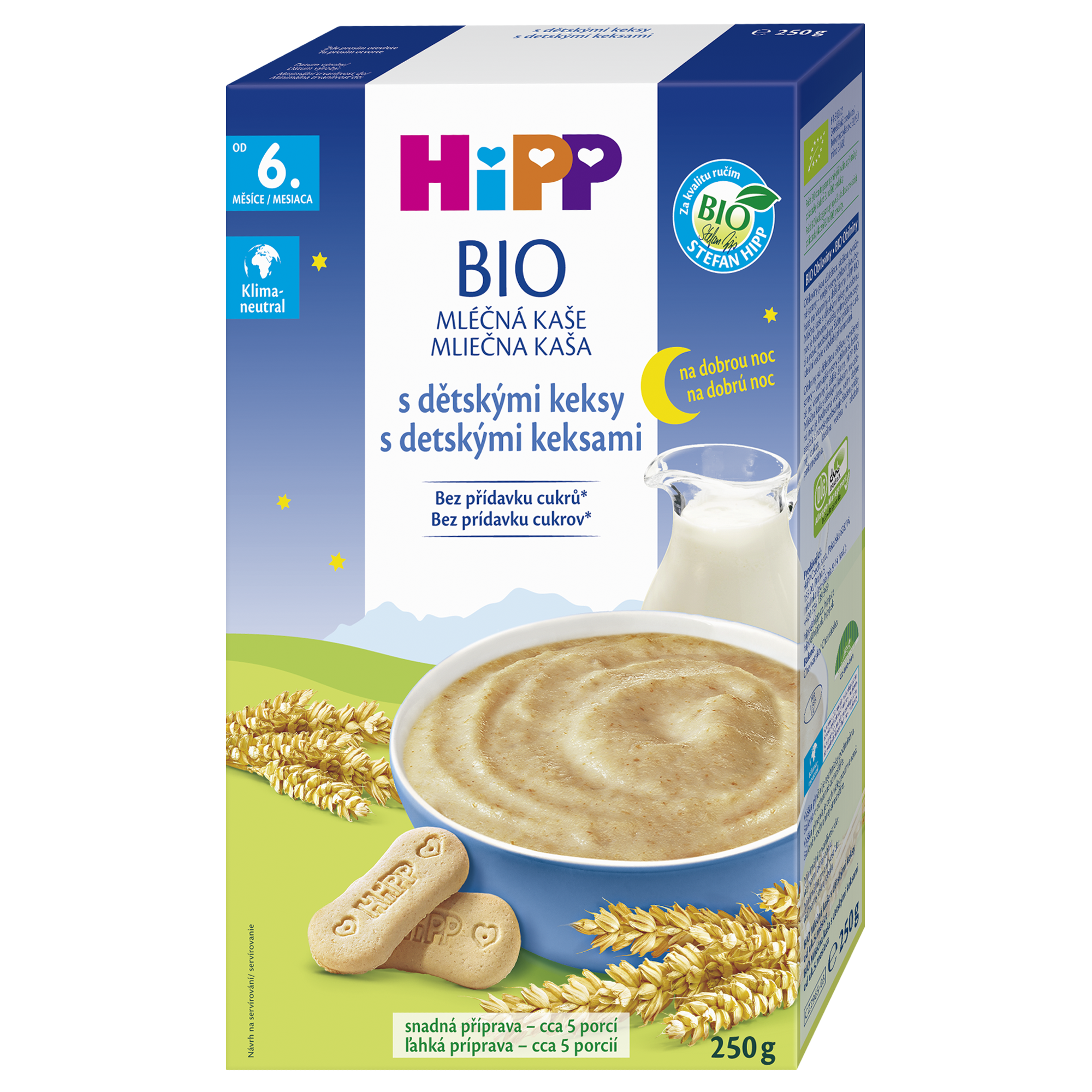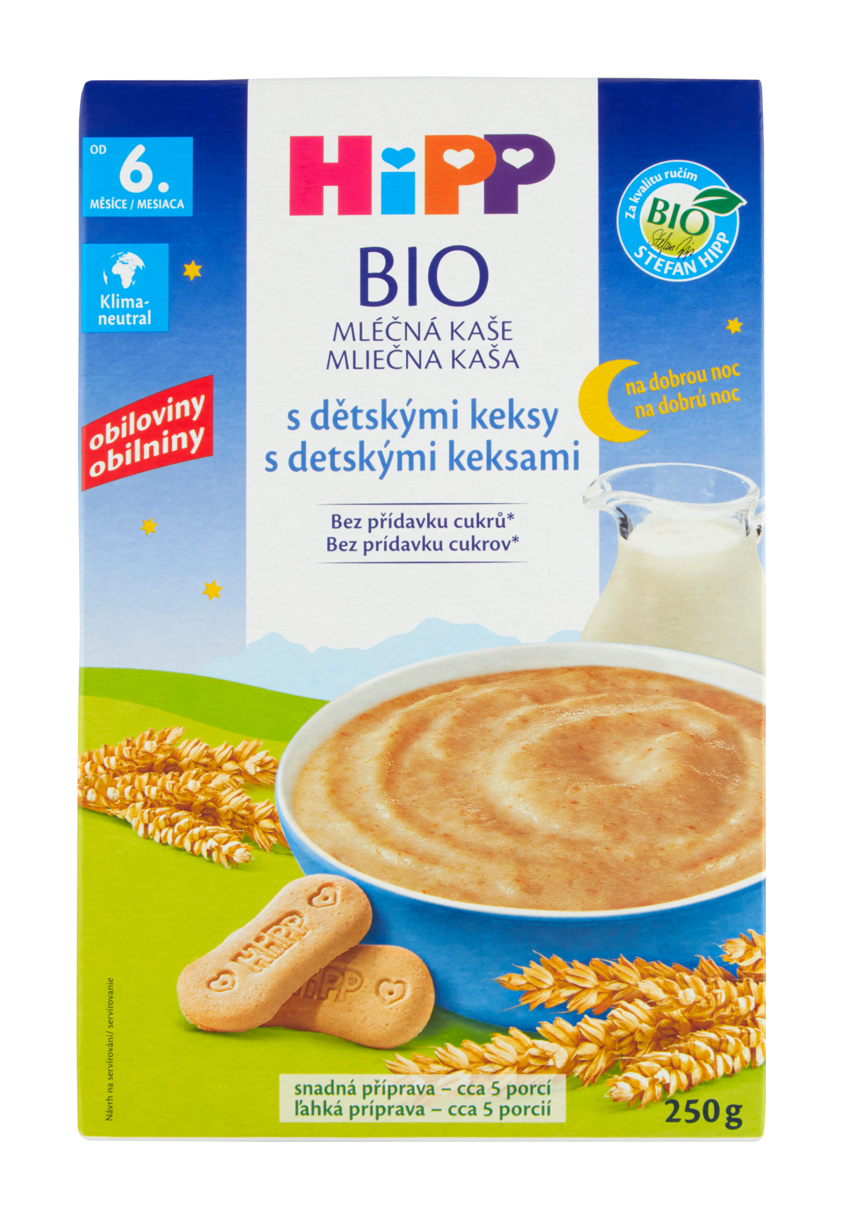 Bio Obiloviny Obiloviny jsou důležitou složkou vyvážené stravy - vnější vrstvy obilovin jsou bohaté na vitaminy a další živiny. HiPP Bio Mléčná kaše s dětskými keksy na dobrou noc je hodnotná večeře, velmi dobře zasytí a navíc neobsahuje žádný přidaný cukr. Ideální večeře v období přikrmování.