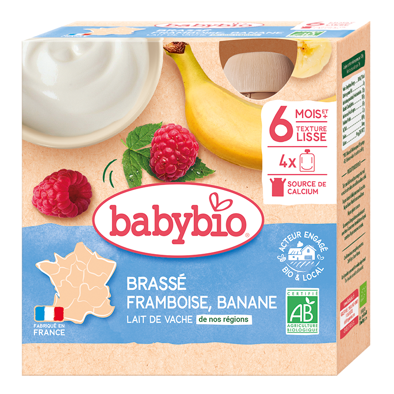 Mléčný bio příkrm (brassé) od 6 měsíců ve čtyřech praktických 85g kapsičkách. Receptura založena na fermentovaném kravském bio mléku (jeho obsah činí více jak 70 %) z francouzských ekofarem v kombinaci s malinou a banánem. Bio výživa pro kojence od ukončeného 6. měsíce. Kombinace sladkých malin a lahodného banánu je léty prověřená. Najdete ji i v naší mléčné svačince, která obsahuje jen ty nejlepší přísady z ekologického zemědělství. Vynikající dezert, který děti milují. Výrobek ekologického zemědělství. Určeno pro zvláštní výživu kojenců a malých dětí. Bez palmového oleje. Bez přidané soli. Bez chemických konzervačních látek, dochucovadel, zahušťovadel a barviv.