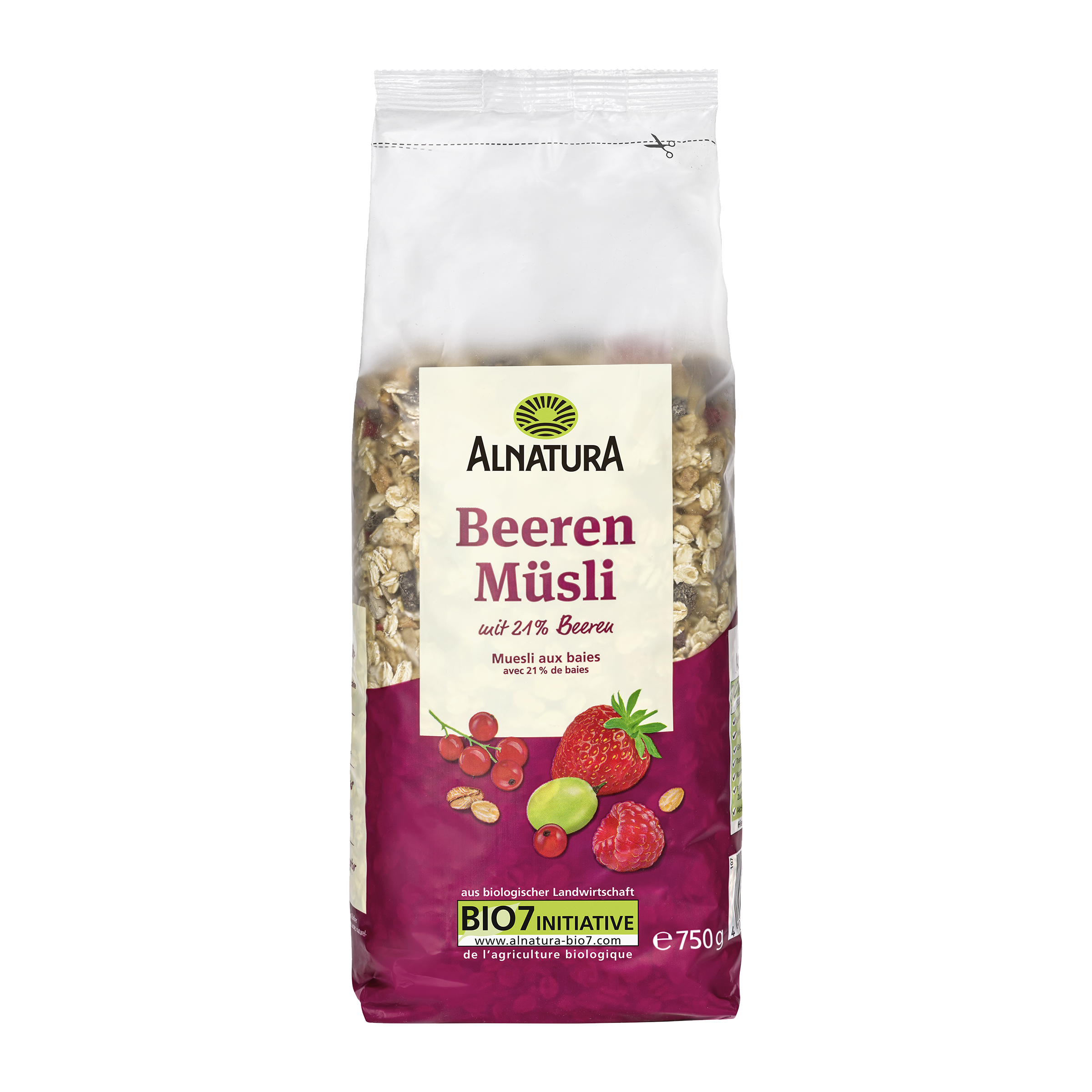 Ovocno-jahodová kombinace na snídaňový stůl: základem müsli Alnatura Berry jsou celozrnné ovesné vločky, zvláštní chuť dodávají lyofilizované jahody, maliny a červený rybíz. Sladkost pochází pouze z obsaženého ovoce (ingredience přirozeně obsahují cukr). Receptura obsahuje pouze BIO ingredience a je veganská.