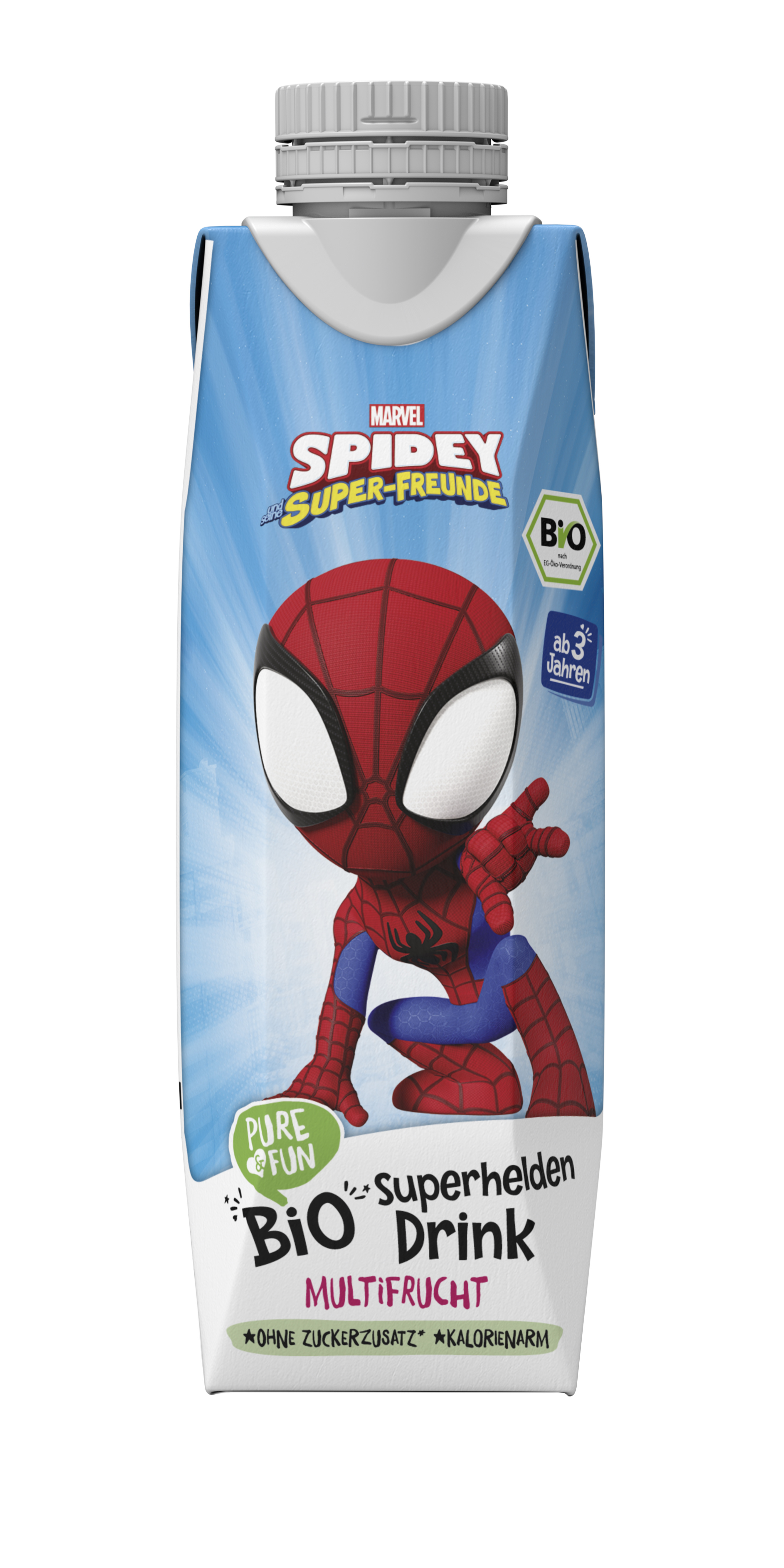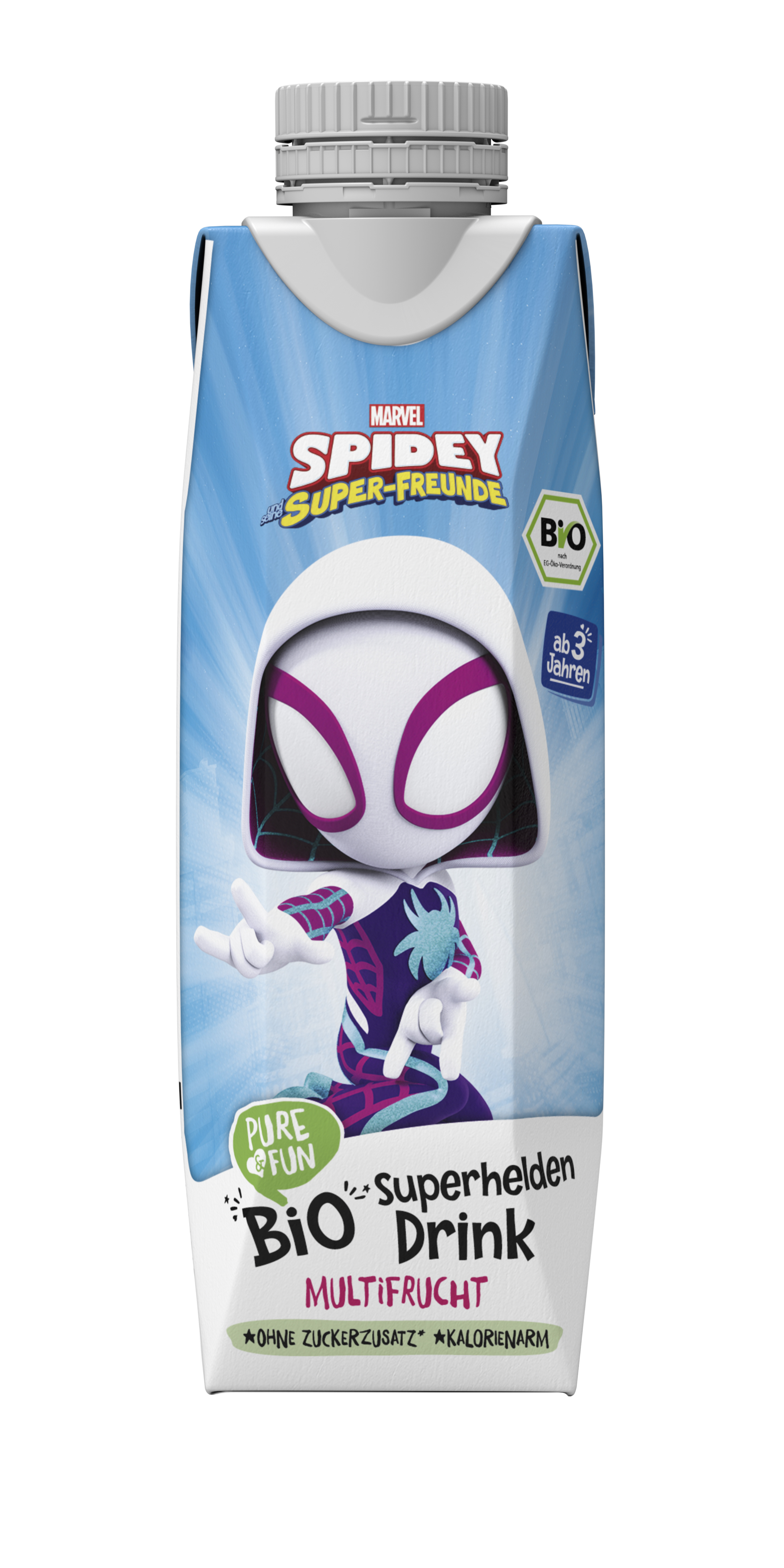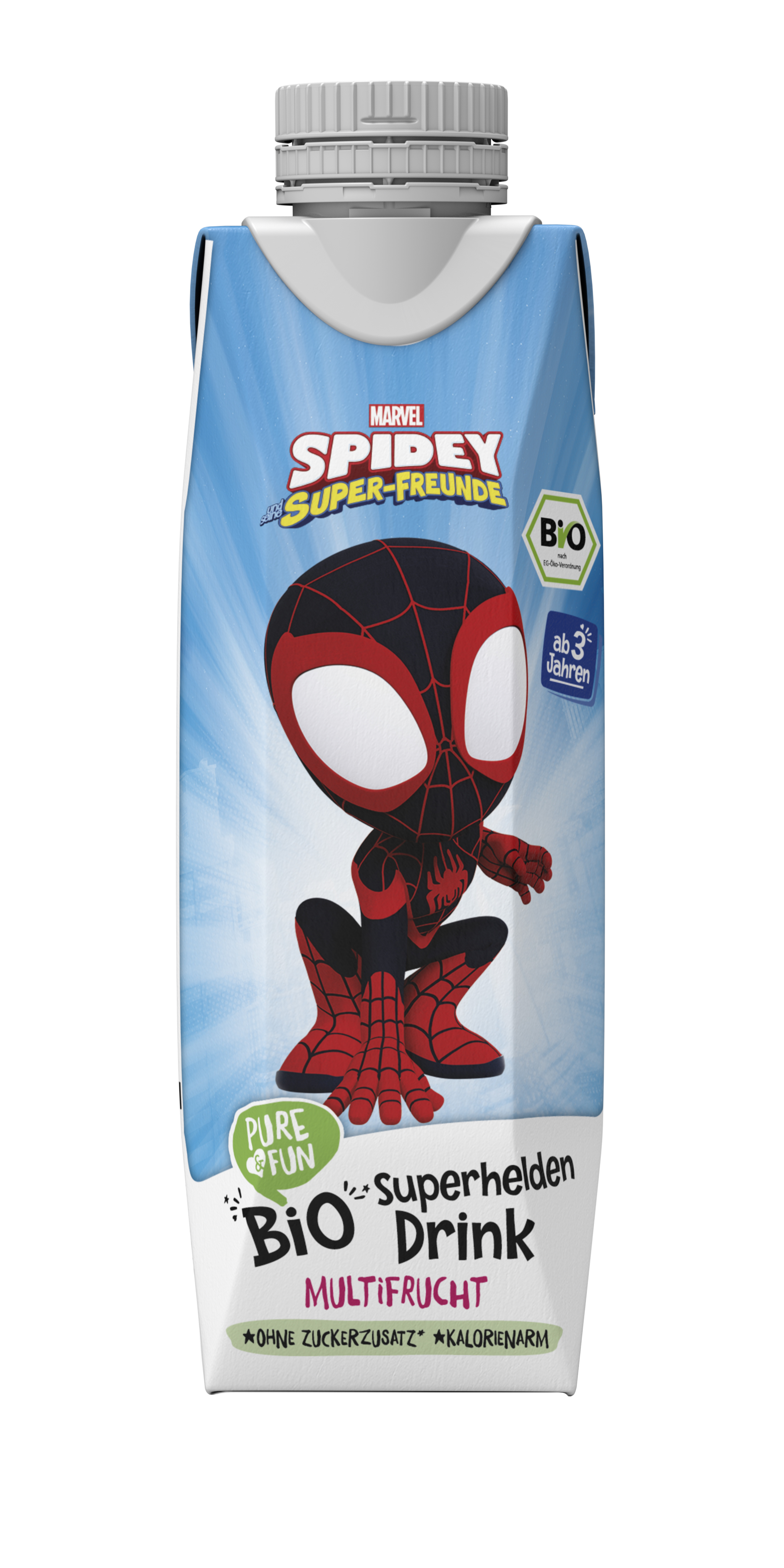 Nízkokalorický nápoj z organické šťávy z více druhů ovoce. S příchutí jablka, hroznů, ananasu, citronu, broskve, manga, grapefruitu a banánu osvěží každého superhrdinu! Čisté složení, zábavná chuť a pořádná dávka energie z přírodních ingrediencí osvěží při každém dobrodružství. Ideální ke svačině na výletě či po tréninku. Bez přidaného cukru, umělých aroma a konzervantů – jen to nejlepší z ovoce v BIO kvalitě.