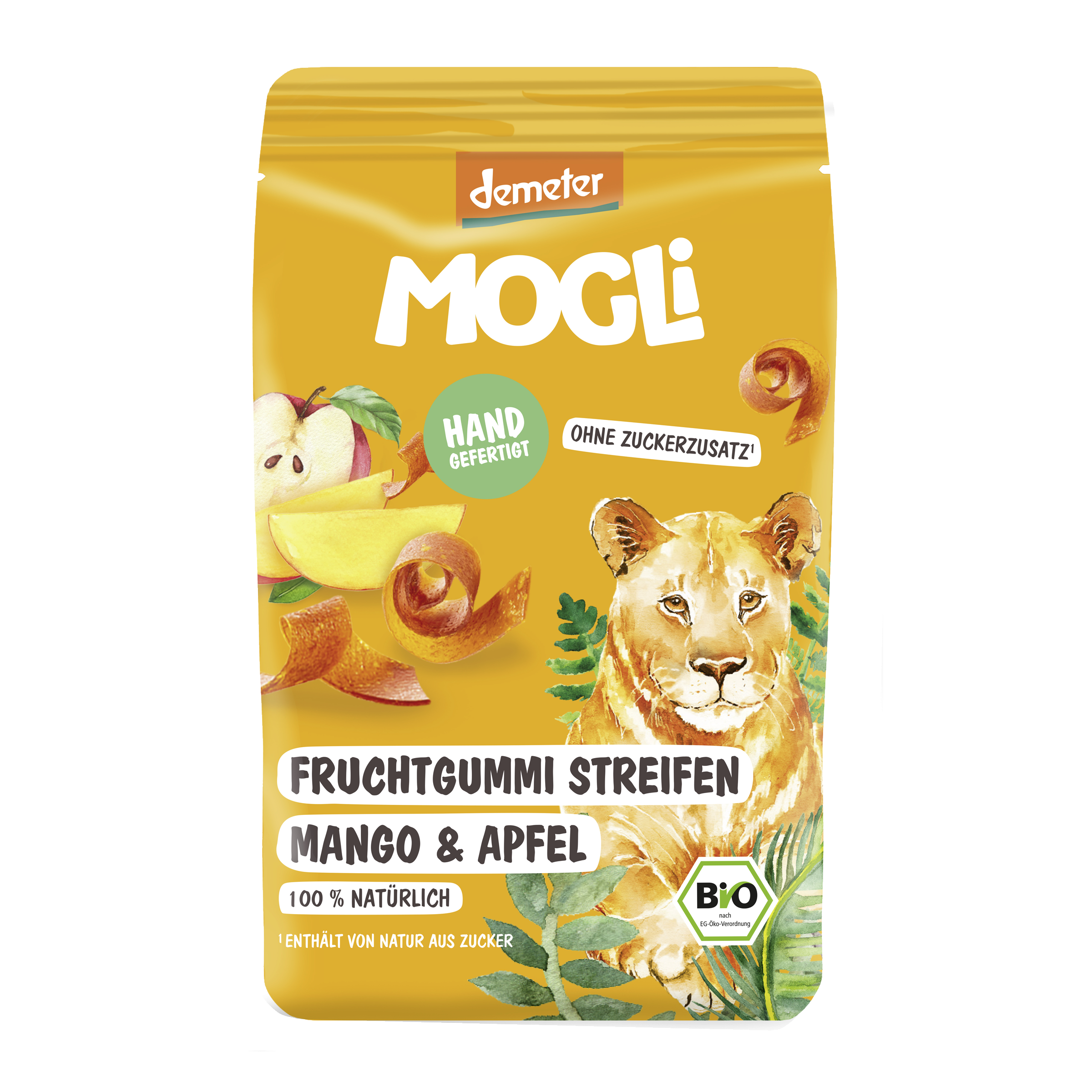 Pytlíček s 10 ovocnými pásky, přes 2 metry sladkého ovocného žvýkání s příchutí manga a jablka. Ovocné pásky MOGLi jsou vyrobené jednoduše ze 3 ingrediencí – jablek, manga a vlákniny psyllium. Ovocné žvýkání s certifikací Demeter bez přidaného cukru dodá energii celé rodině.