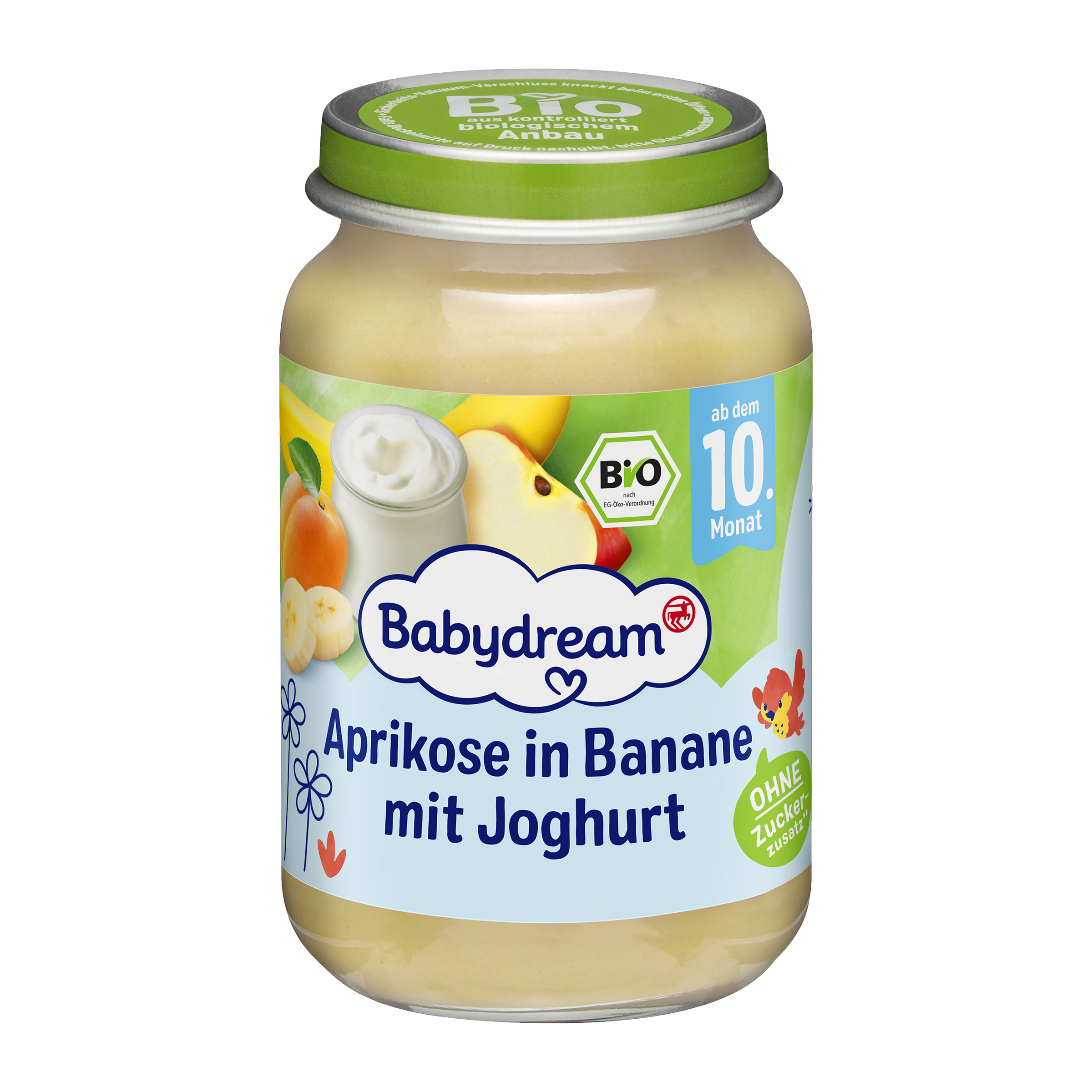 Voda, banány * 25%, jogurt * 25%, meruňky * 13%, jablka *, rýžový škrob *, rýžová mouka *, regulátor kyselosti uhličitan vápenatý.