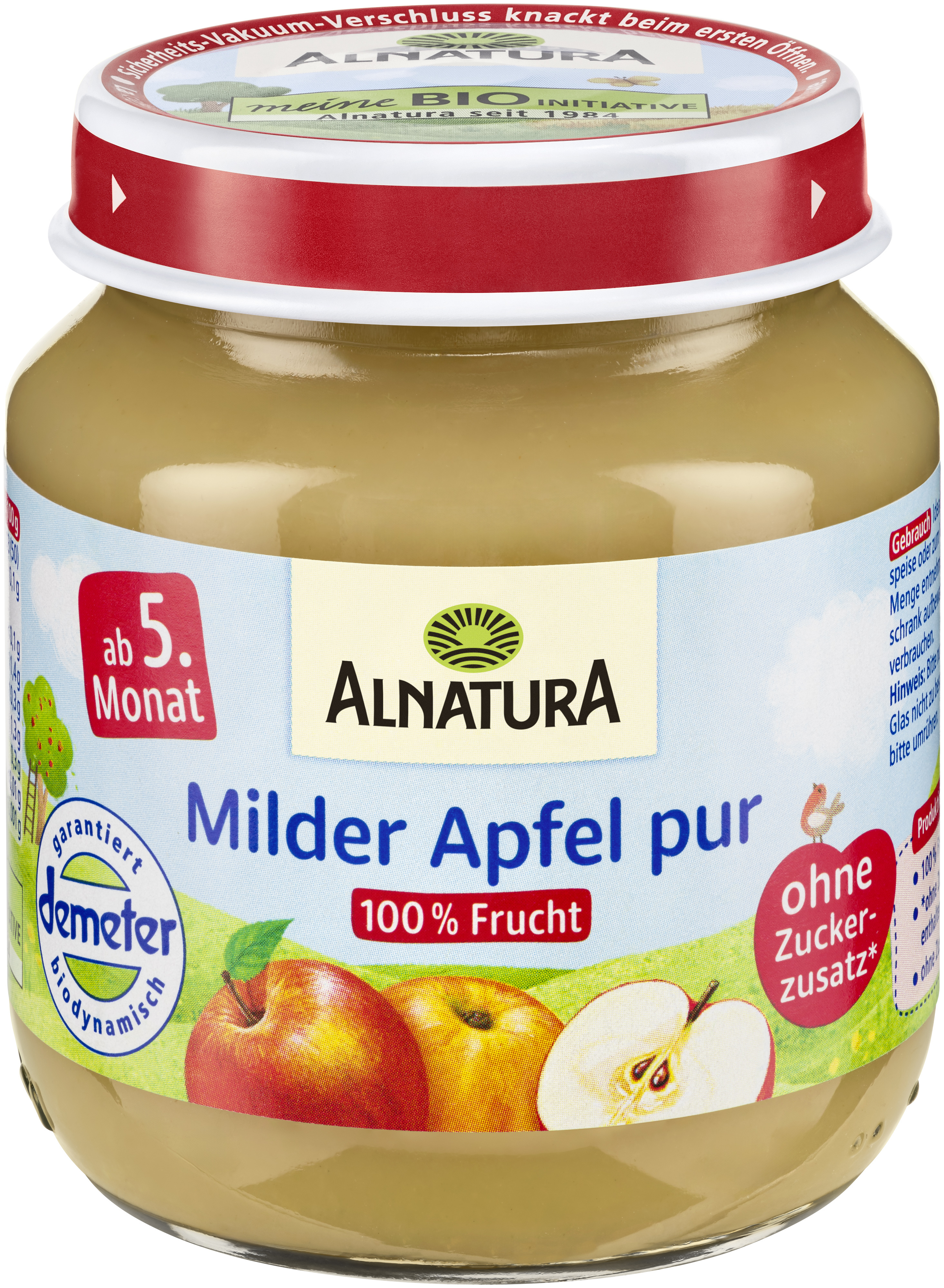 Jemné pyré vyrobené z jediné složky: stoprocentně jemného bio jablka v kvalitě Demeter. Bez lepku a bez přidaného cukru (suroviny přirozeně obsahují cukr). Pro děti od ukončeného 5. měsíce věku.
