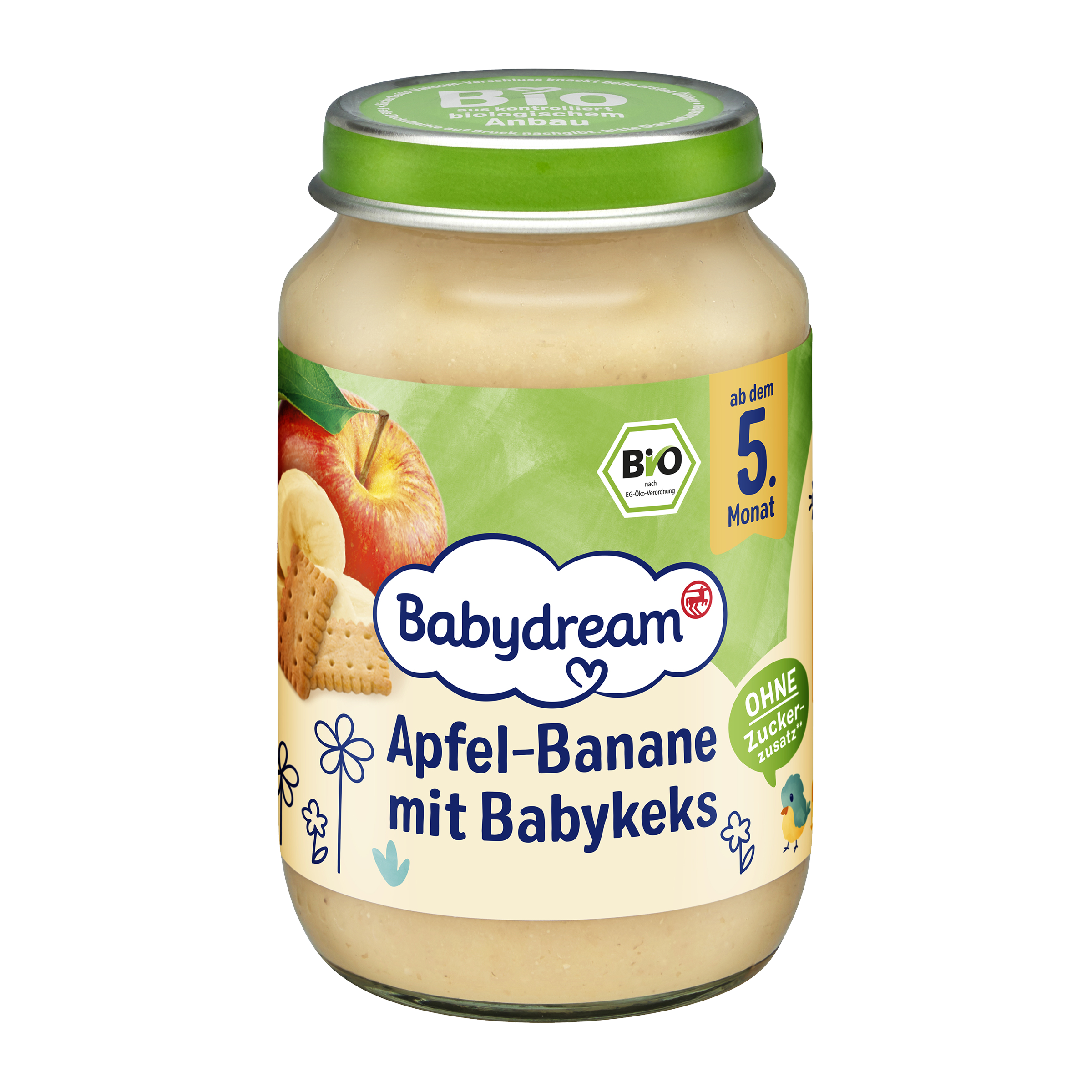 Jablka* 45 %, voda, banány* 20 %, mleté sušenky* 5 % (PŠENIČNÁ mouka*, PŠENIČNÁ obilovina*, MÁSLO*, PŠENIČNÝ škrob*), citronová šťáva*, rýžový škrob*.