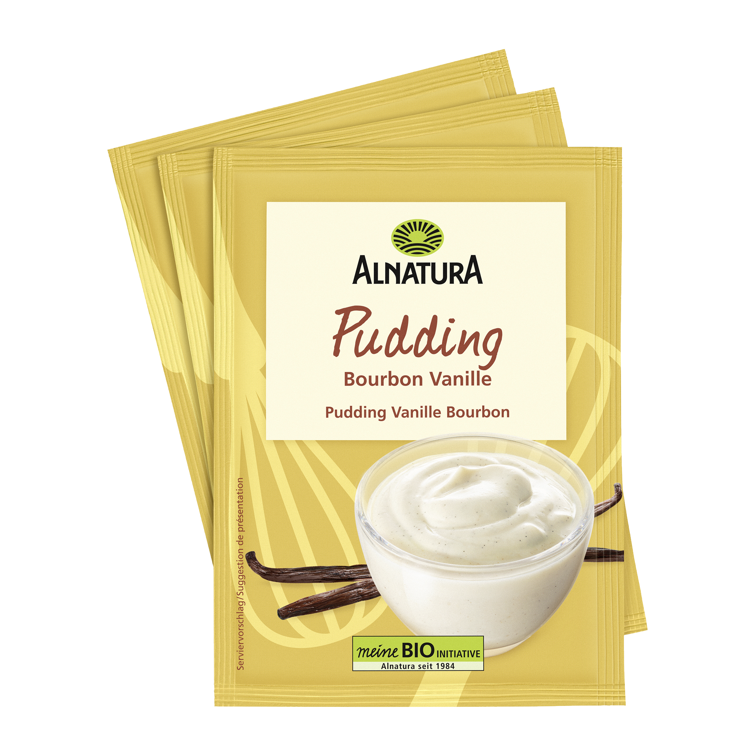 Vanilkový pudink: Vezměte 6 lžic 500 ml mléka a rozmíchejte s pudinkovým práškem a 2 lžícemi (cca 40 g) surového třtinového cukru Alnatura dohladka. Zbylé mléko přiveďte k varu, stáhněte z ohně a vmíchejte rozmíchaný pudinkový prášek. Pudink za stálého míchání přivedeme k varu a nalijeme do misky vypláchnuté studenou vodou.