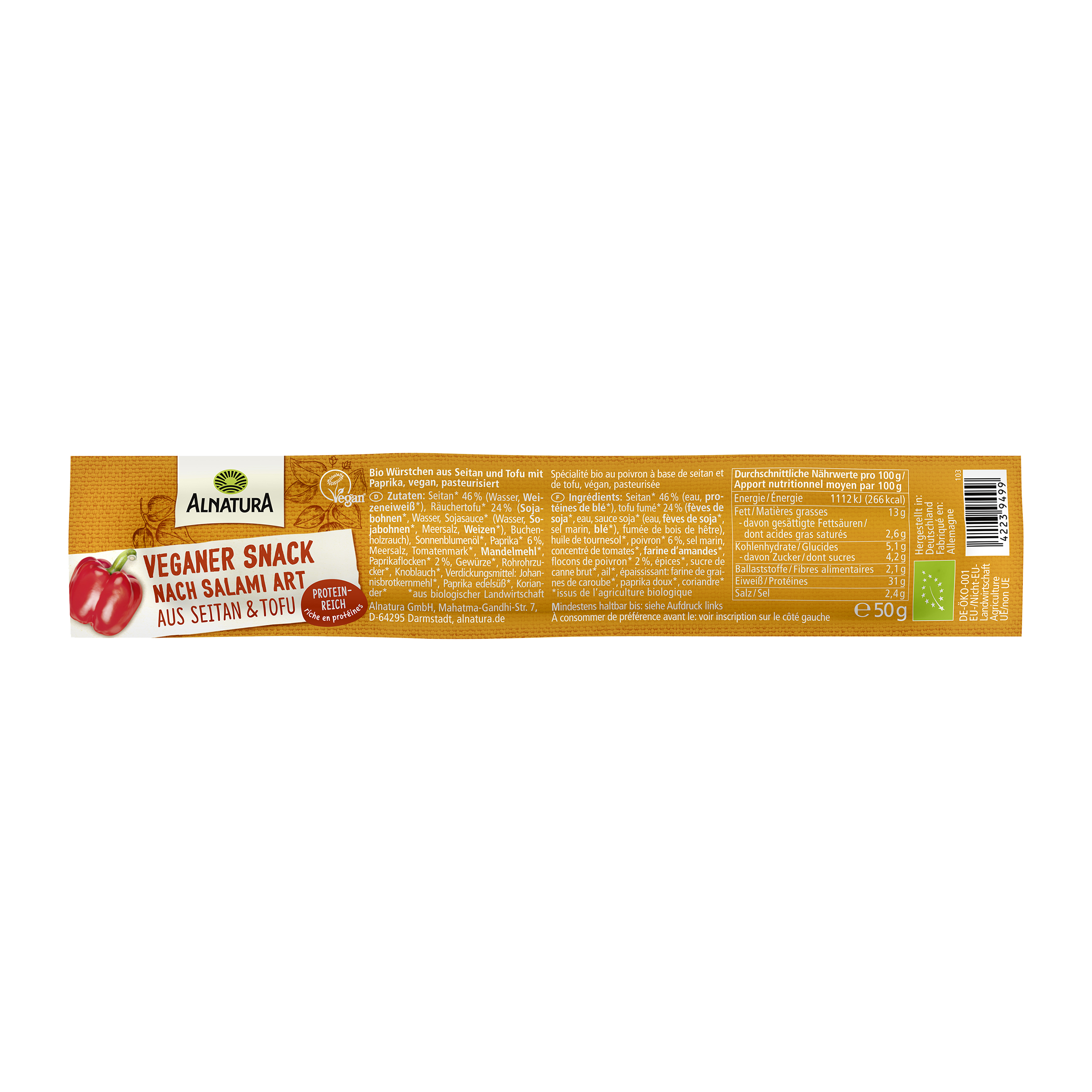Veganská svačinka bohatá na bílkoviny na bázi tofu a seitanu (pšeničná bílkovina); pikantní, kořeněná chuť ve stylu salámu. Praktické balení z něj dělá ideálního společníka na cesty a svačinu na přestávky. U nechlazeného salámu Alnatura Vegan Snack Salami Style jsou všechny zemědělské suroviny pěstovány podle ekologických norem.