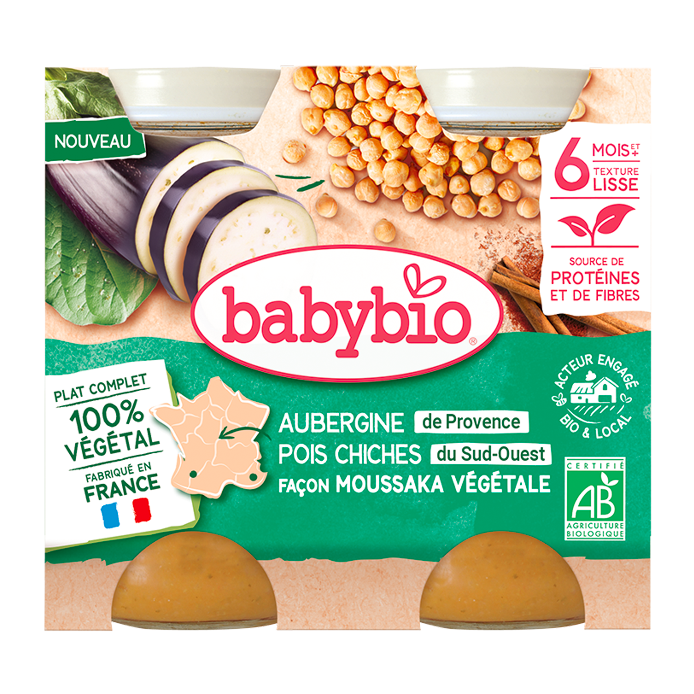 Mrkev z Francie* 24 %, brambory z Centre-Val de Loire* 19 %, voda z vaření, lilek z Provence* 15 %, vařená cizrna z jihozápadní Francie* 9 % ,rajčatové pyré z Nouvelle-Aquitaine* 8 %, cibule z Francie* 5 %, extra panenský olivový olej*, skořice*, česnek ze Španělska*, tymián z Francie*. bez přidané soli, bez mléka, obsahuje lepek. *složky ekologického zemědělství Naše receptury se mohou vyvíjet. Složení a nutriční hodnoty té šarže, kterou jste zakoupili, naleznete vždy na obalu produktu.