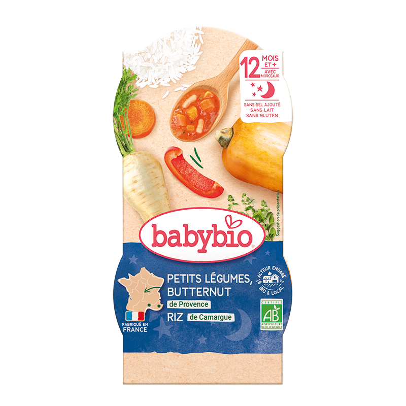 Kombinace bio zeleniny a přílohy připravená pro každé hladové bříško. Ve Francii tradičně podáváme jako večeři. Tento chutný zeleninový příkrm je součástí řady našich večerních menu. Jsou to výživná jídla, která nezatěžují dětské bříško před spaním. A i když jsou plné chutí a lehkých ingrediencí, jsou navržena tak, aby vaše děti mohly klidně a spokojeně spát. V mističce najdete máslovou dýni z Provence, francouzskou mrkev, pastinák z údolí řeky Loiry a francouzskou cibuli. Zeleninu jsme doplnili rýží z oblasti Camargue. Vaše děťátko si na příkrmu jistě pochutná až do poslední lžičky. Příkrmy v misce jsou velmi praktické - snadno je sbalíte kamkoli s sebou a pod dohledem se může z misky děťátko nakrmit i samo. Vařeno v páře. Baleno v ochranné atmosféře. Obal bez BPA.