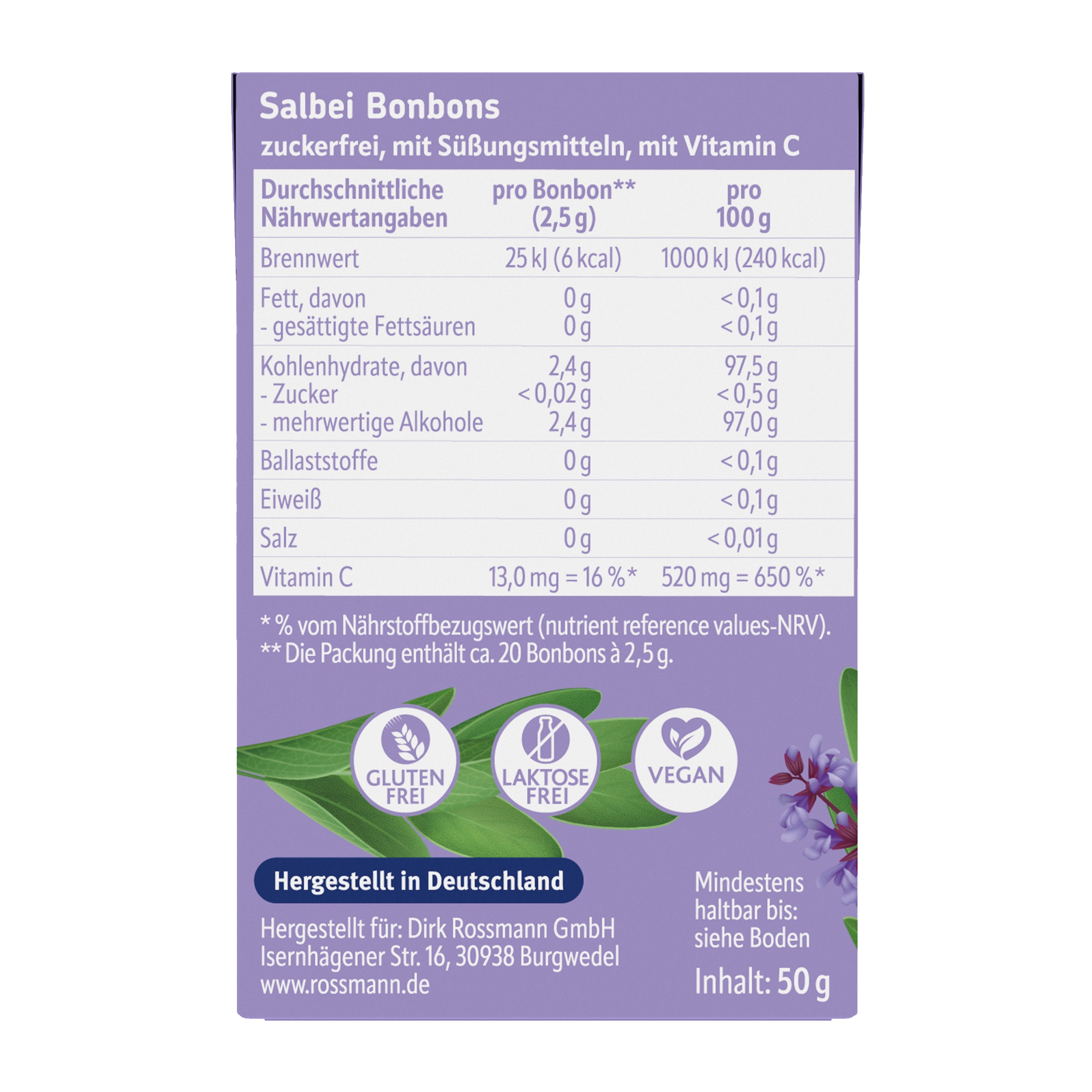 Sladidla: isomalt, aspartam, acesulfam K, kyseliny: kyselina citronová, kyselina mléčná, šalvějovo bylinný extrakt 0,85 %, vitamin C, šalvějový olej.