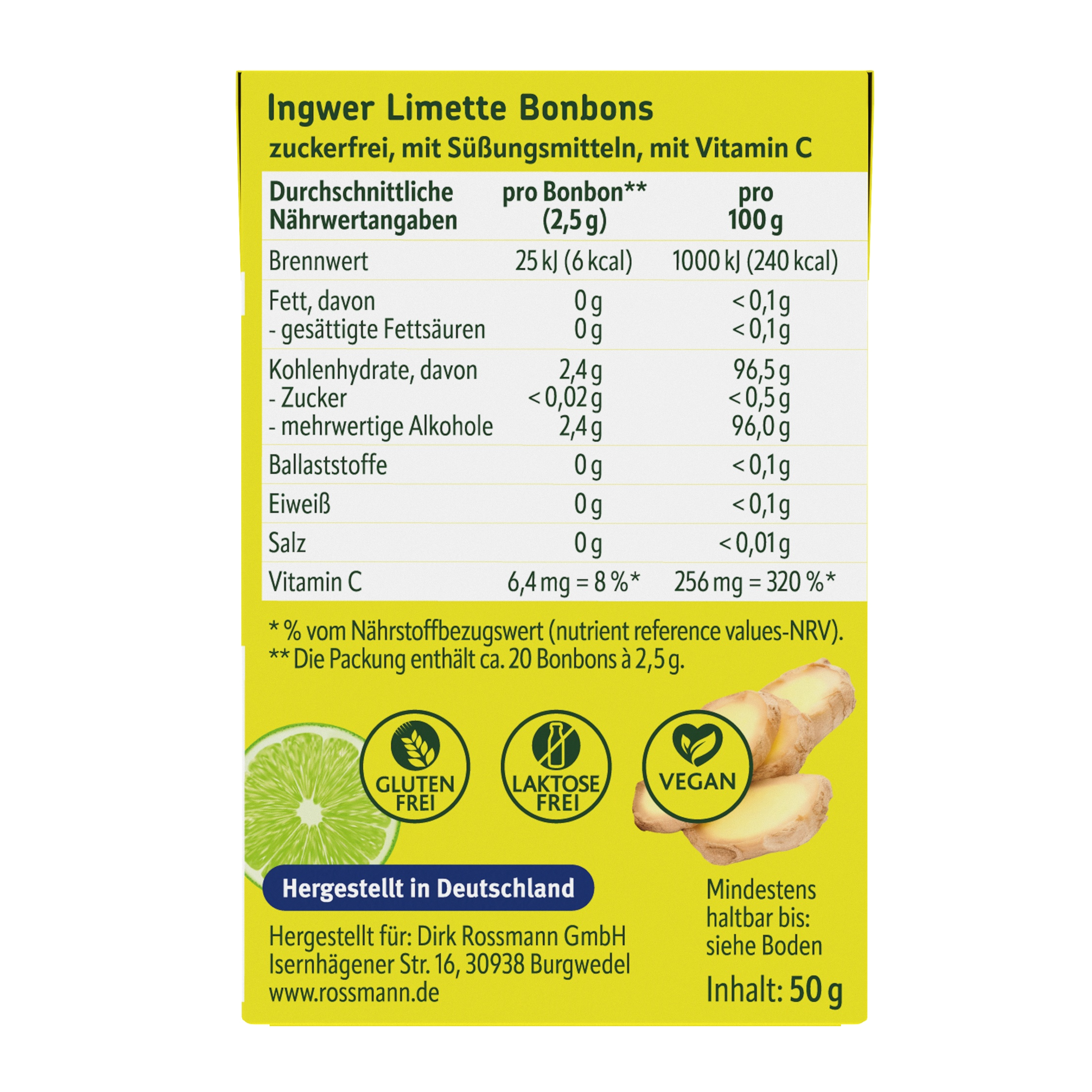 Sladidla: isomalt, aspartam, acesulfam K, kyseliny: kyselina citronová, kyselina mléčná, zázvorový extrakt 0,85 %, vitamin C, přírodní limetové aroma, barvivo: měďnaté komplexy chlorofylů a chlorofylinů, přírodní zázvorové aroma, přírodní aroma