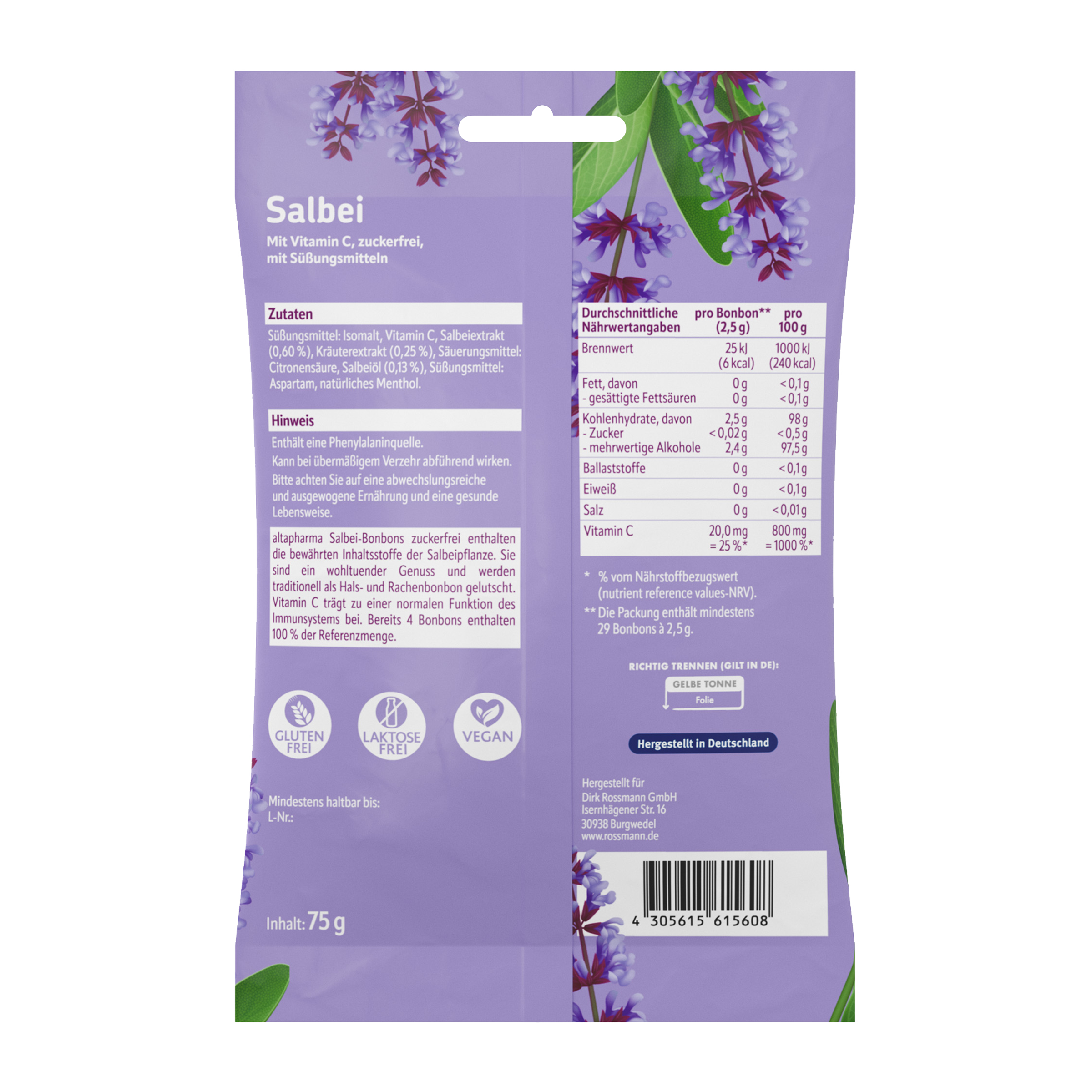 Vitamín C přispívá k normální funkci imunitního systému a bonbony se šalvějovým extraktem, se sladidly a vitaminem C navíc příjemně voní přírodou.
