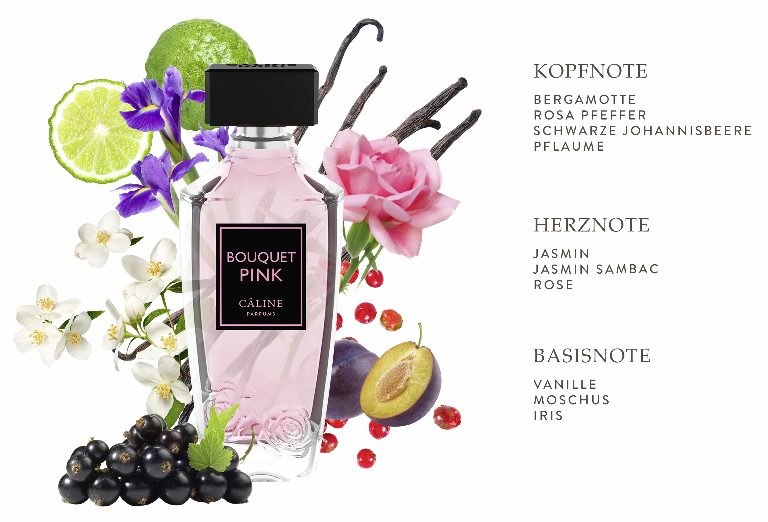 Inspirovaná nadčasovou elegancí francouzského životního stylu, Câline Bouquet Pink Eau de Parfum ztělesňuje luxusní ženskost. Sambacový jasmín, vanilka a pižmo se mísí s růžovým pepřem a bergamotem a vytvářejí svěží, smyslnou vůni. Moderní černo-růžový design ztělesňuje radost ze života a stylovou sofistikovanost. Výrazná vůně pro moderní ženy, které žijí s elegancí a lehkostí.