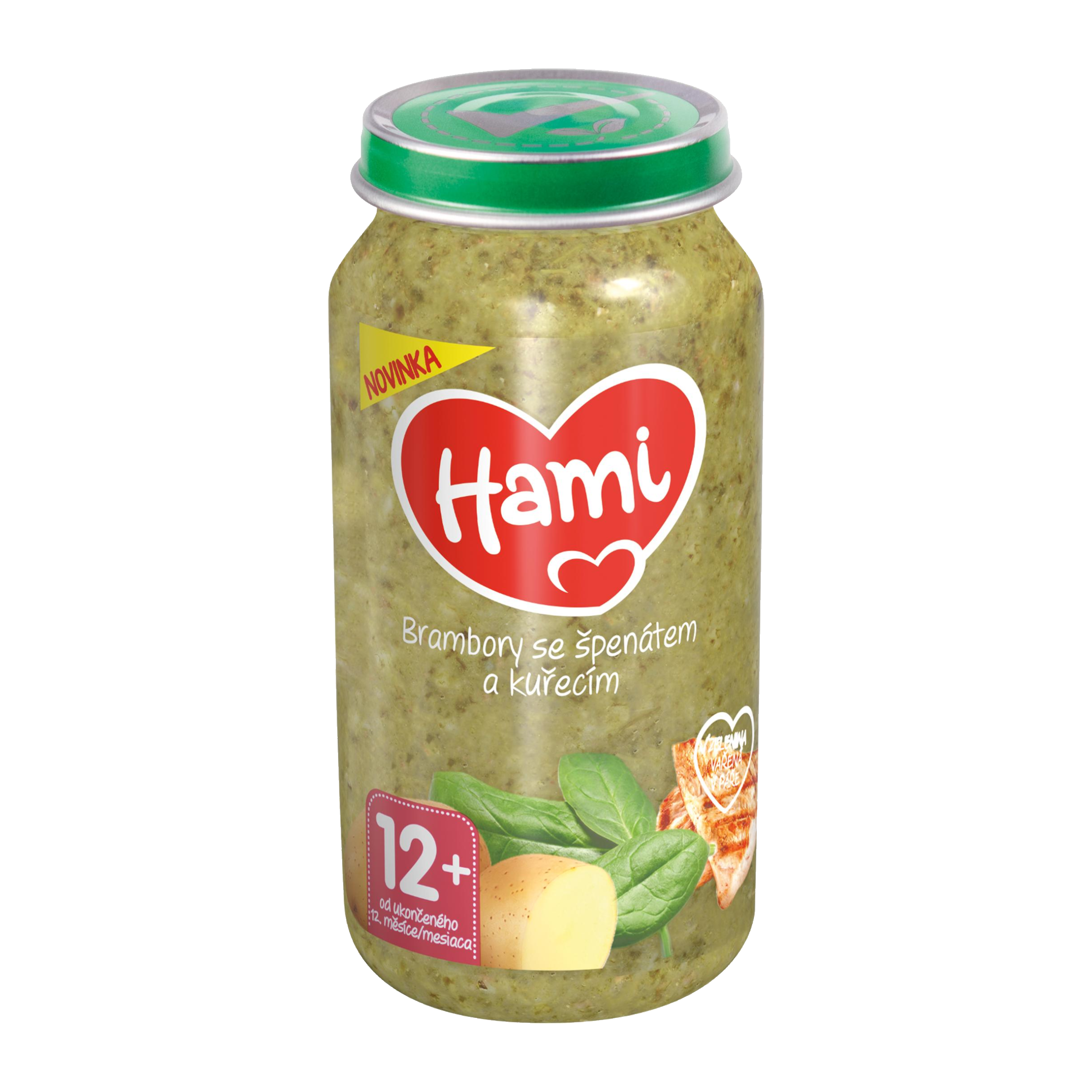 Hami příkrm Brambory se špenátem a kuřecím nabízí jemnou a vyváženou kombinaci oblíbených chutí, které si malí strávníci zamilují. Tento výživný pokrm je vyroben ze surovin kojenecké kvality, neobsahuje přidanou sůl*, lepek ani konzervanty (dle zákona). Špenát a brambory jsou vařené v páře, což pomáhá zachovat jejich přirozené živiny i chuť. Díky obsahu omega-3 mastných kyselin podporuje zdravý vývoj mozku a nervové soustavy. Ideální volba pro pestrou a vyváženou stravu dítěte v jeho prvních 1000 dnech života.