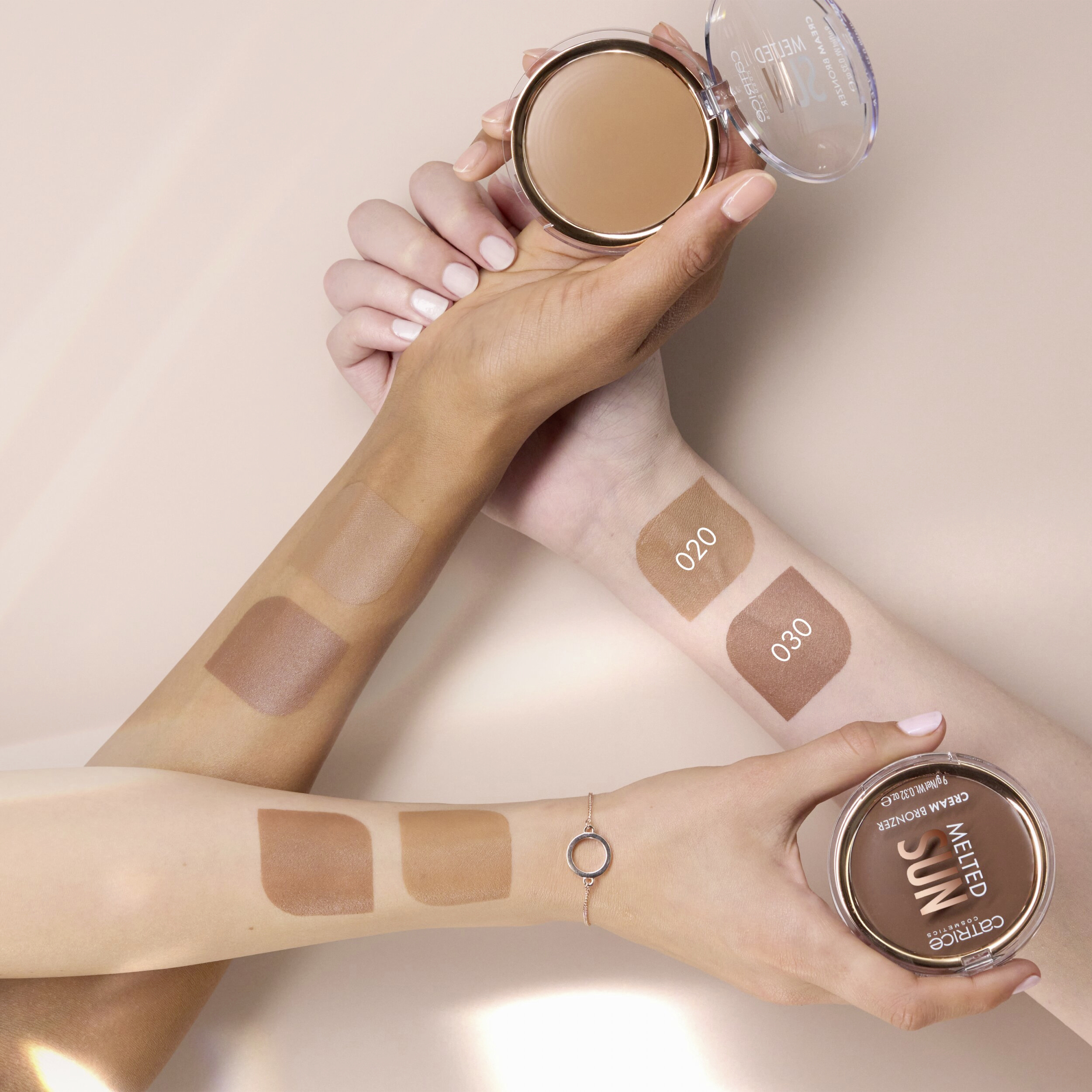 CATRICE Krémový bronzer Melted Sun dodává pleti opálený vzhled. Snadno se nanáší a roztírá. Jemná krémová textura s vrstvitelným krytím se prakticky vstřebává do pokožky a vytváří matný a hladký vzhled.
