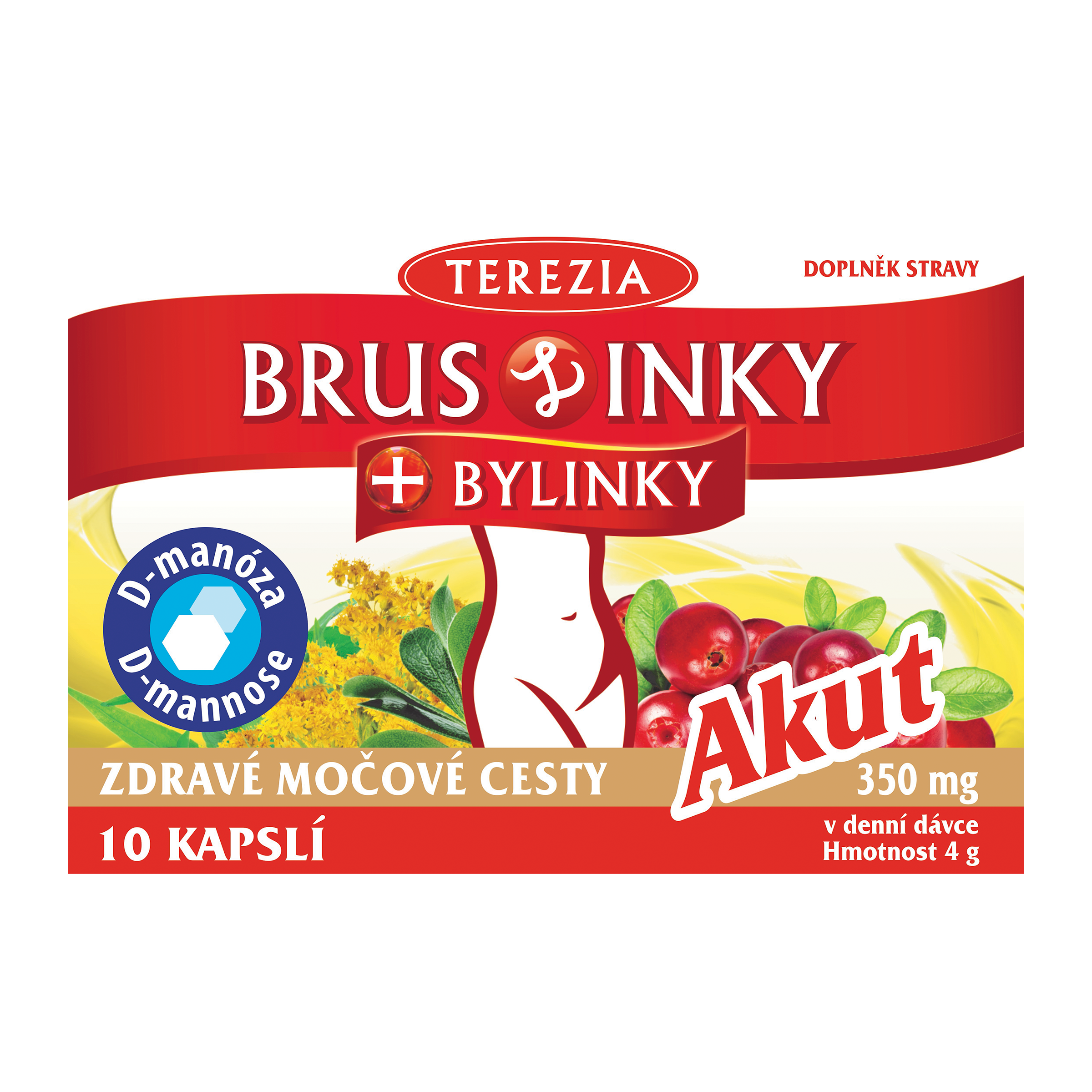 1 kapsle obsahuje 350 mg směsi BRUSLINKY + BYLINKY AKUT [prášek sušeného extraktu z plodů brusnice brusinky (Vaccinium vitis-idaea) 250 mg, extrakt a list medvědice lékařské (Arctostaphylos uva-ursi) 33 mg, extrakt z listu brusnice, truskavec ptačí (Polygonum aviculare), zlatobýl obecný (Solidago virgaurea), D-manóza, škrob]. Obal kapsle: želatina.
